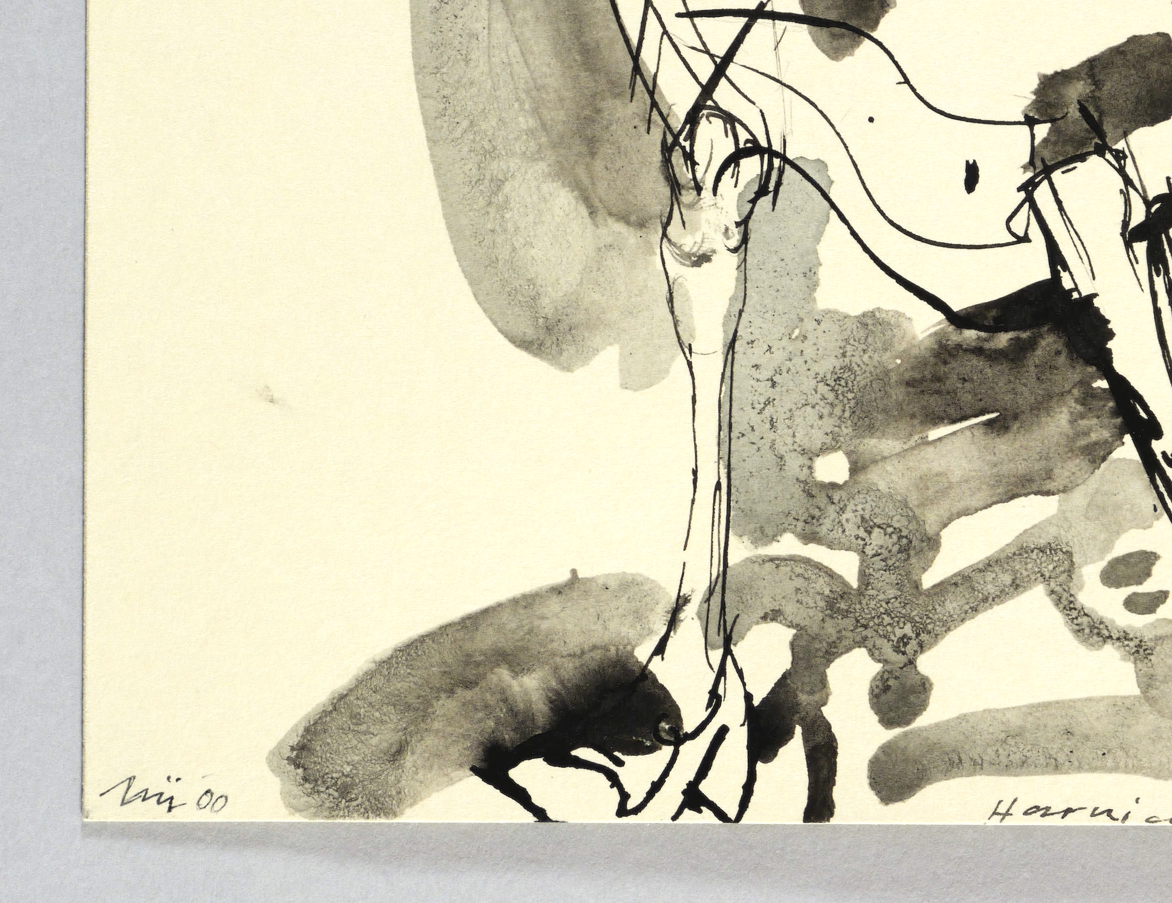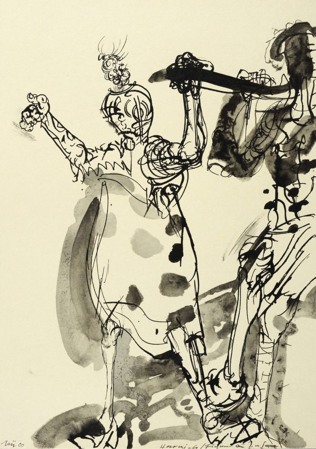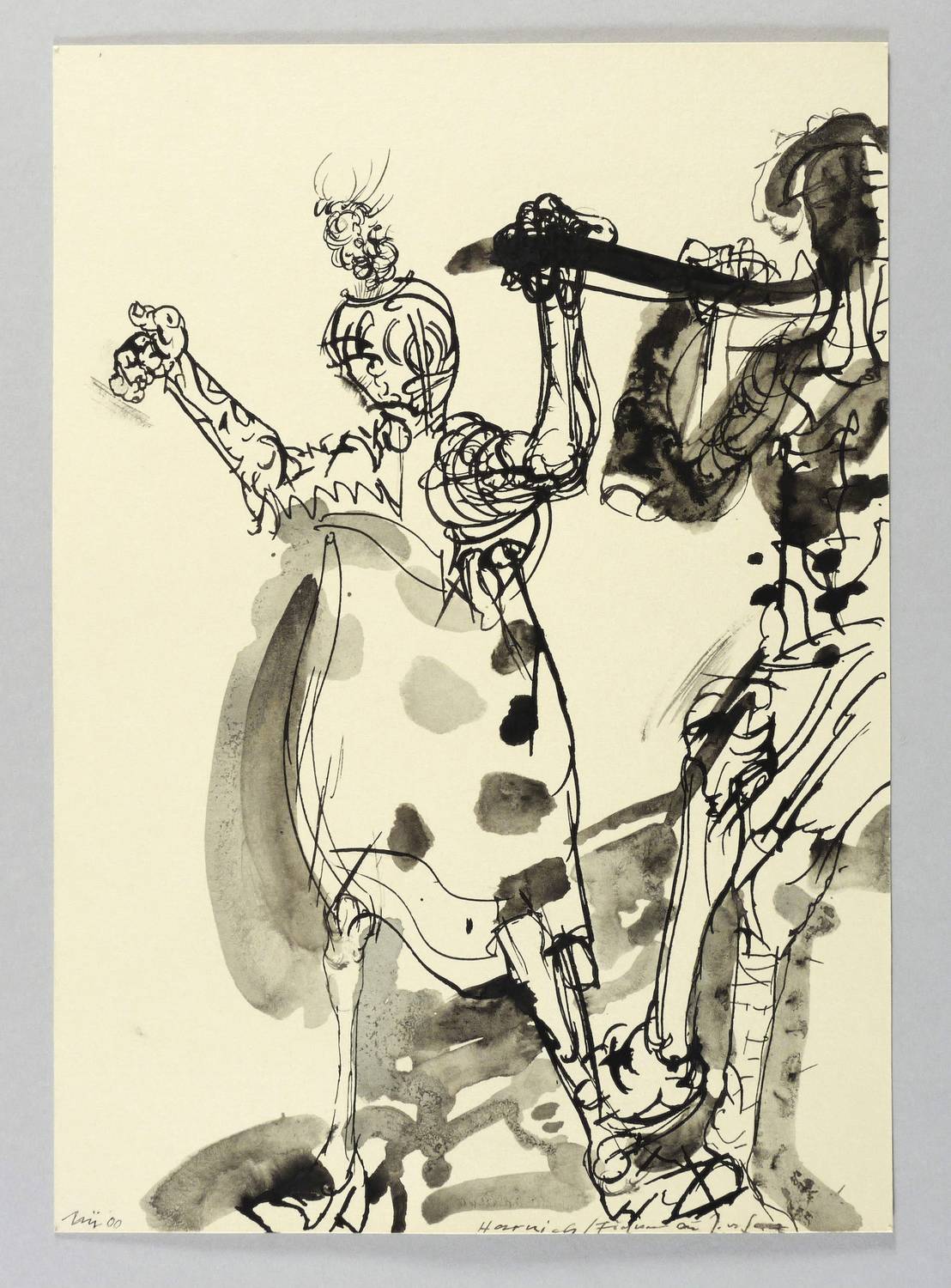 Links unten in Tusche signiert und datiert. Mittig dazu betitelt. Verso in Tusche bezeichnet ″Harnisch / Figuren zu J. v. Saaz″. – Vom Künstler original auf Trägerkarton gesetzt und in Passepartout montiert. Sehr guter Zustand.