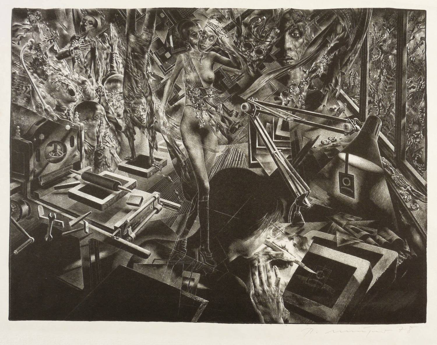 Rolf Münzner (1942 Geringswolde, lebt und arbeitet in Geithain bei Leipzig). Deutscher Zeichner und Grafiker. 1956-60 Lehre und Arbeit als Maschinenschlosser in Leisnig. 1960-62 besucht er Abendkurse an der Hochschule für Grafik und Buchkunst in Leipzig (HGB). 1962-67 Studium der Grafik und Illustration an der HGB u.a. bei Werner Tübke. 1969-72 Aspirantur. 1973-92 Lehrauftrag für Aktzeichnen und Illustration an der HGB. Seit 1990 Leiter der Werkstatt für Lithografie. Seit 1992 Professor. Seine skurrilen Figuren und bewegungsreichen Phantasiewelten werden in der seltenen Technik der Asphaltschabmanier im Steindruck umgesetzt. Detailreichtum und gesteigerte Virtuosität charakterisieren sein Werk ebenso wie eine Vorliebe für literarische Themen, denen er jeweils kongeniale Schöpfungen an die Seite stellt.