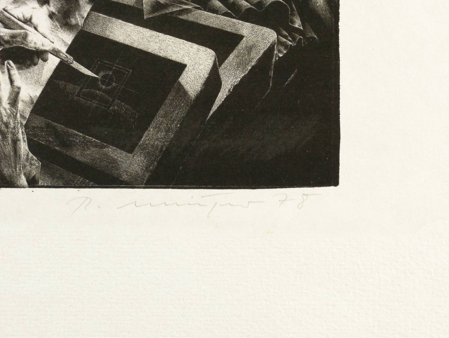 1978. Lithografie / Schablithografie, in Schwarz, auf hellchamois Kupferdruckkarton. – Originale Künstlergrafik, von Rolf Münzner. – Künstlerexemplar (e.a.). – 21,8 x 28,7 cm (Darstellung / Druckbild), 24,0 x 36,8 cm (Stein), 36 x 48 cm (Blatt).