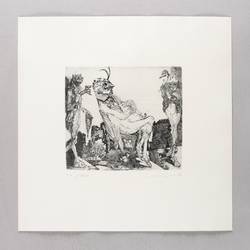 1986. Radierung / Strichätzung, mit Plattenton, auf hellchamois Weißenborn. – Originale Künstlergrafik, von Rolf Münzner. – Auflage Exemplar Nr. 77/200. – 17,4 x 19,5 cm (Darstellung / Platte), 36 x 36 cm (Blatt).
