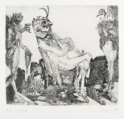 Rolf Münzner (1942 Geringswolde, lebt und arbeitet in Geithain bei Leipzig). Deutscher Zeichner und Grafiker. 1956-60 Lehre und Arbeit als Maschinenschlosser in Leisnig. 1960-62 besucht er Abendkurse an der Hochschule für Grafik und Buchkunst in Leipzig (HGB). 1962-67 Studium der Grafik und Illustration an der HGB u.a. bei Werner Tübke. 1969-72 Aspirantur. 1973-92 Lehrauftrag für Aktzeichnen und Illustration an der HGB. Seit 1990 Leiter der Werkstatt für Lithografie. Seit 1992 Professor. Seine skurrilen Figuren und bewegungsreichen Phantasiewelten werden in der seltenen Technik der Asphaltschabmanier im Steindruck umgesetzt. Detailreichtum und gesteigerte Virtuosität charakterisieren sein Werk ebenso wie eine Vorliebe für literarische Themen, denen er jeweils kongeniale Schöpfungen an die Seite stellt.