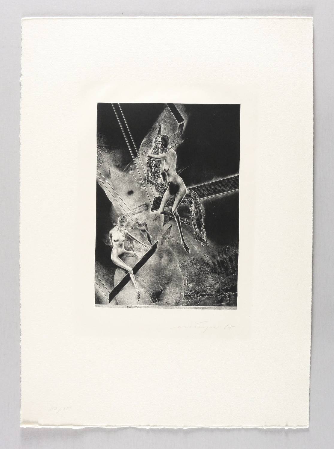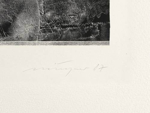 1987. Lithografie / Schablithografie, in Schwarz, auf chamois Hahnemühle. – Originale Künstlergrafik, von Rolf Münzner. – Auflage Exemplar Nr. 20/30. – 23,8 x 16,7 cm (Darstellung / Druckbild), 28,5 x 21,0 cm (Stein), 48 x 34 cm (Blatt).