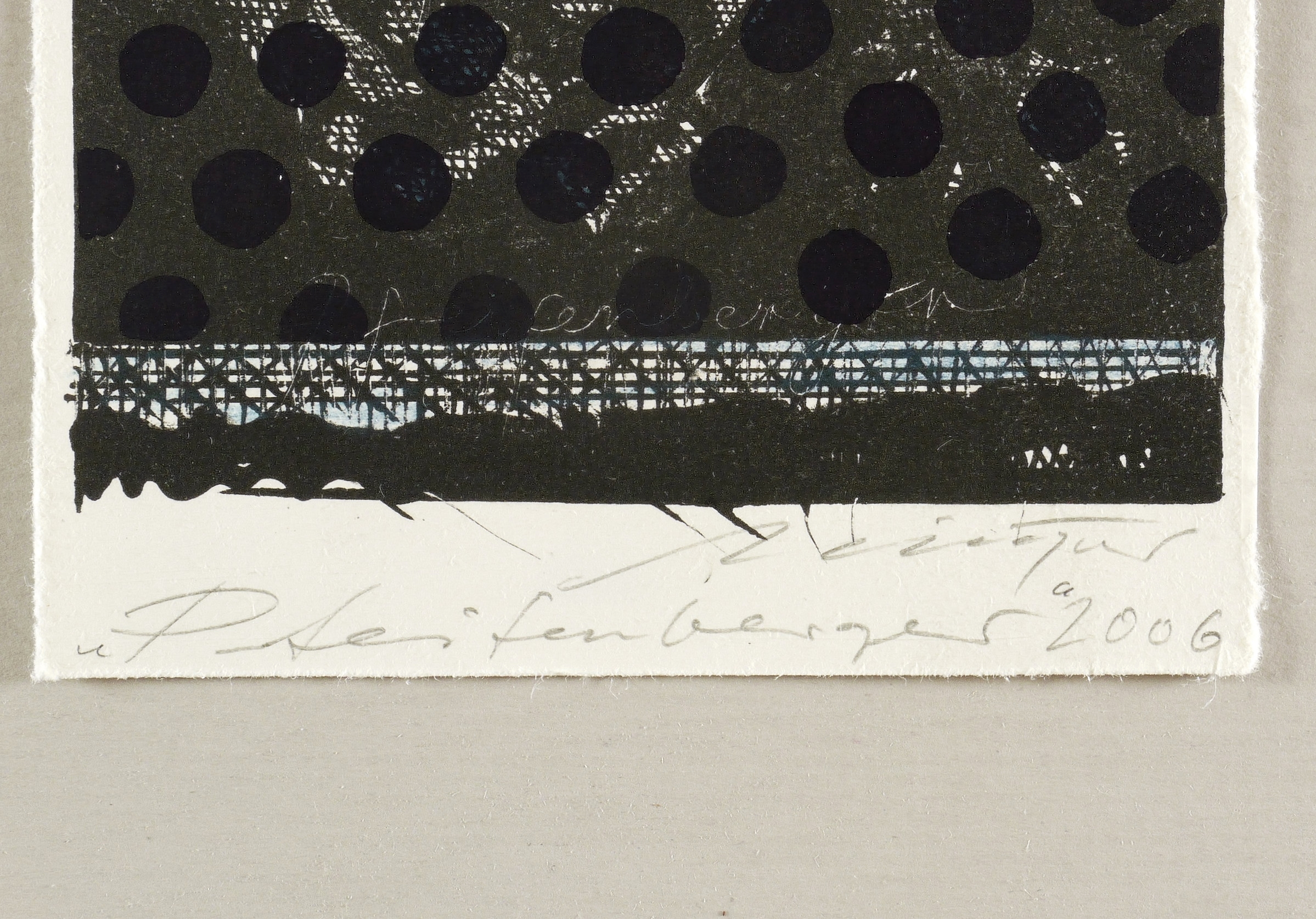 2006. Mischtechnik / Tusche & Farbkreide, über Schablithografie, in Schwarz, auf hellchamois Velin. – Originale Künstlergrafik, von Rolf Münzner. – Unikat. – 20,0 x 9,8 cm (Darstellung / Druckbild), 22,6 x 10,5 cm (Blatt).