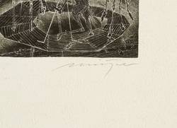 1990. Lithografie / Schablithografie, in Schwarz, auf hellem genarbtem Velin. – Originale Künstlergrafik, von Rolf Münzner. – Künstlerexemplar (e.a.). – 9,6 x 7,3 cm (Darstellung / Druckbild), 18 x 12 cm (Blatt).