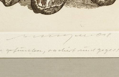 Nicht bei Lindner. – Rechts unten in Bleistift signiert und datiert: ″Münzner 018″. Im unteren Rand bezeichnet: ″auf Bornholm gefunden, radiert und gegessen″. Verso Widmung. – Sehr guter Zustand.