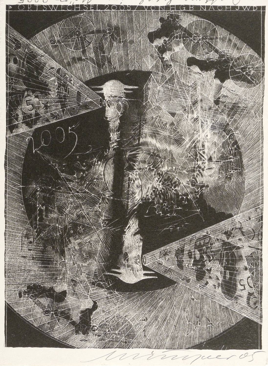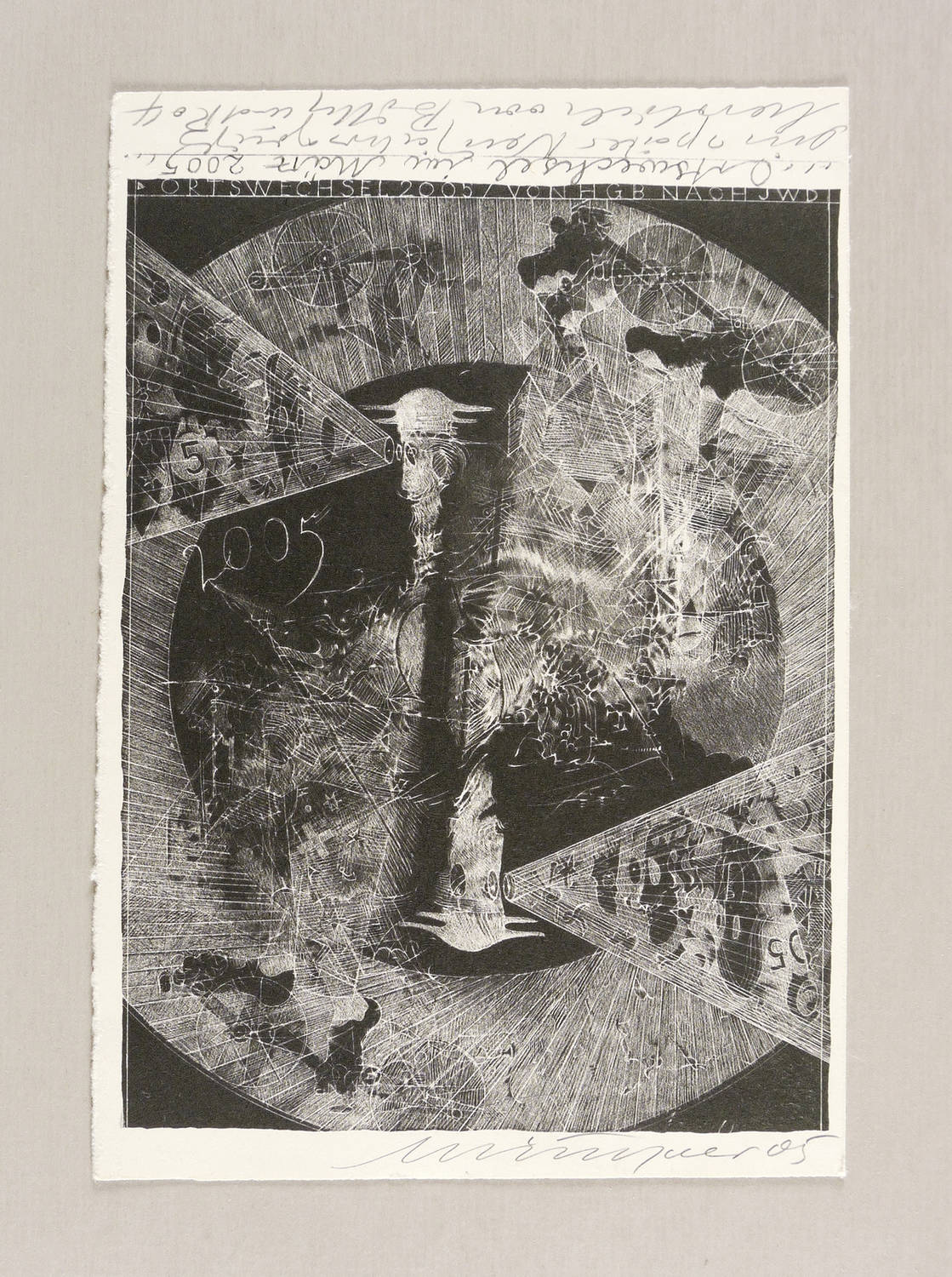 2005. Lithografie / Schablithografie, in Schwarz, auf leichtem hellchamois Velin. – Originale Künstlergrafik, von Rolf Münzner. – Künstlerexemplar (e.a.). – 19,1 x 14,2 cm (Darstellung / Druckbild), 22 x 16 cm (Blatt).