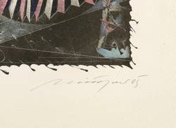 2005. Lithografie / Schablithografie, in Schwarz, aquarelliert, auf hellchamois Velin. – Originale Künstlergrafik, von Rolf Münzner. – Unikat. – 24,8 x 16,7 cm (Darstellung / Druckbild), 40 x 27 cm (Blatt).