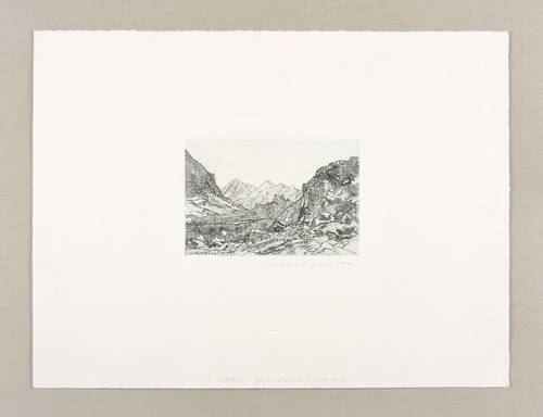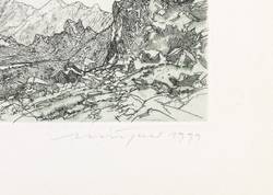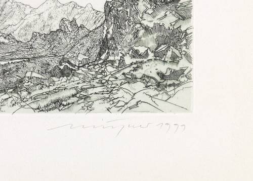 Nicht bei Lindner. – Rechts unten in Bleistift signiert und datiert: ″Münzner 1999″. Im unteren Rand betitelt: ″Am Geisspfad / Wallis″. Dazu Prägestempel der Druckerei Reinhard Rössler, Hohenossig. – Sehr guter Zustand.