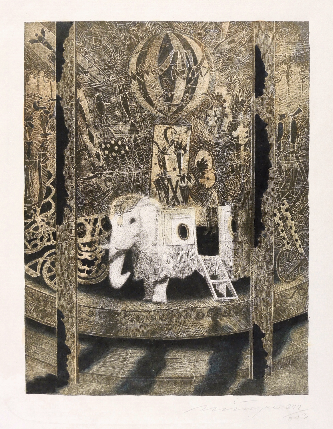 Rechts unten in Bleistift signiert und datiert: ″Münzner 012/013″. Im unteren Blattrand Titel: ″Und dann und wann ein weißer Elefant / R.M. Rilke (Jardin du Ludembg.)″. – Ohne Mängel. Sehr guter Zustand.