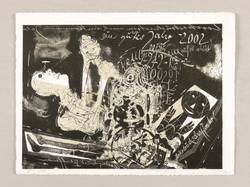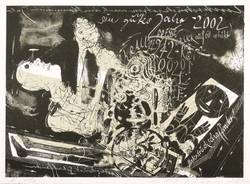 2001/2002. Lithografie / Schablithografie, in Tusche & Deckweiß überarbeitet, auf kräftigem Velin. – Originale Künstlergrafik, von Rolf Münzner. – Künstlerexemplar (e.a.). – 13,8 x 19,1 cm (Darstellung / Druckbild), 15,5 x 20,8 cm (Blatt).