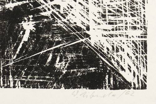 1982. Holzschnitt, in Schwarz, auf leichtem hellchamois Velin. – Originale Künstlergrafik, von Walter Libuda. – Auflage Exemplar Nr. 30/100. – 35,9 x 39,7 cm (Darstellung / Druckbild), 40 x 53 cm (Blatt).