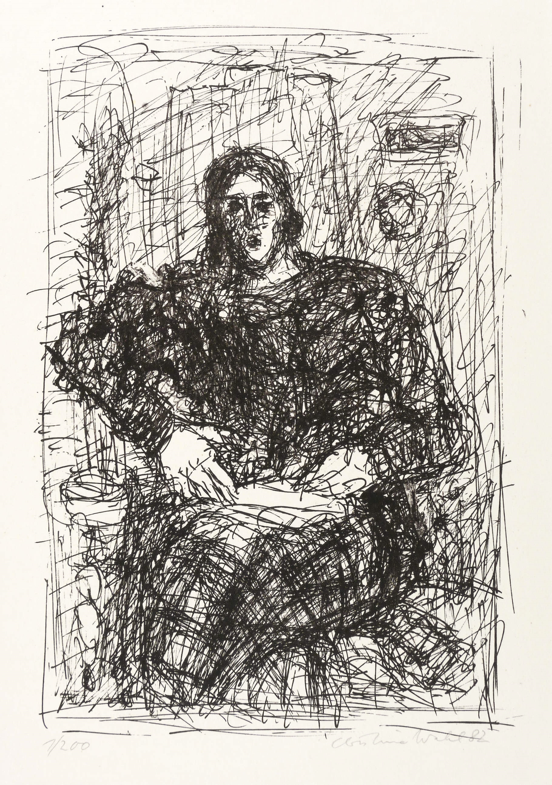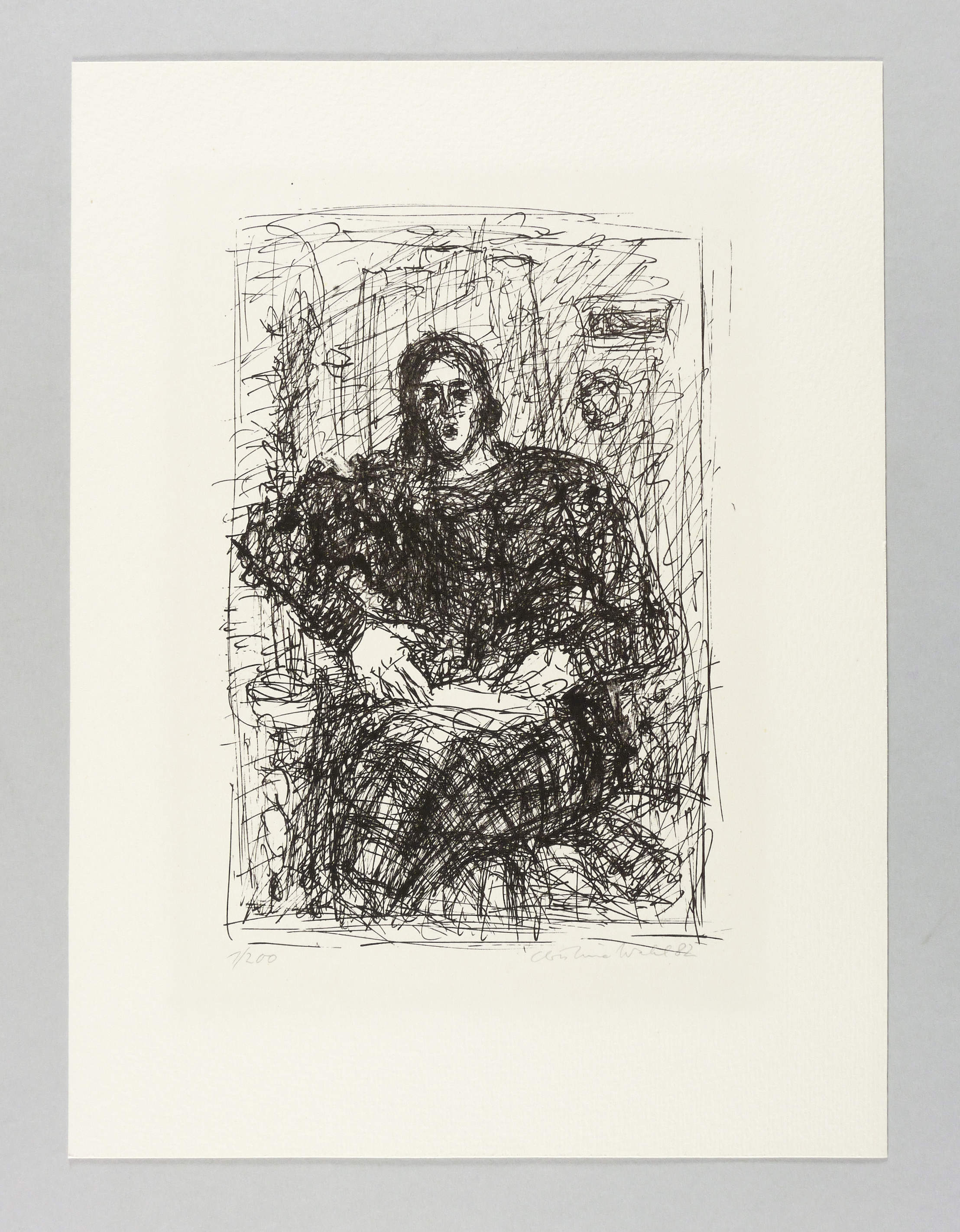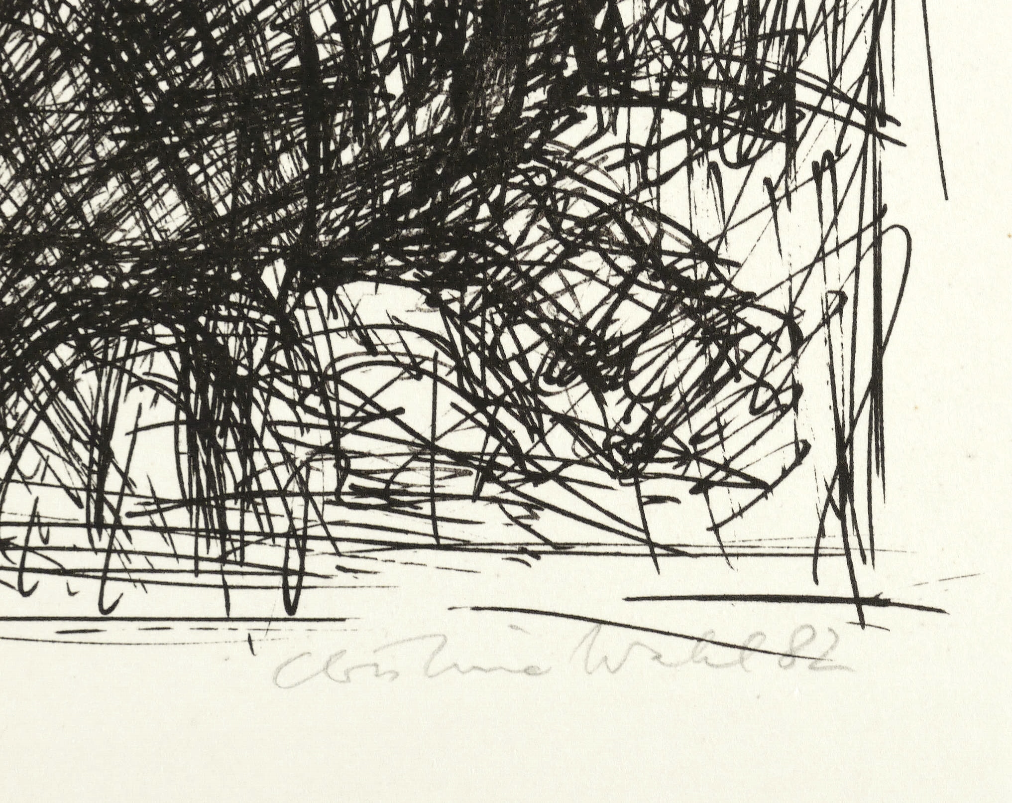 1982. Lithografie / Federlithografie, in Schwarz, auf Weißenborn-Bütten. – Von Christine Wahl. – Auflage Exemplar Nr. 1/200. – 22,3 x 15,6 cm (Darstellung / Druckbild), 33 x 25 cm (Blatt).