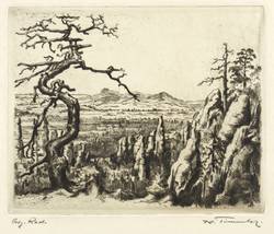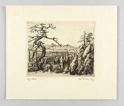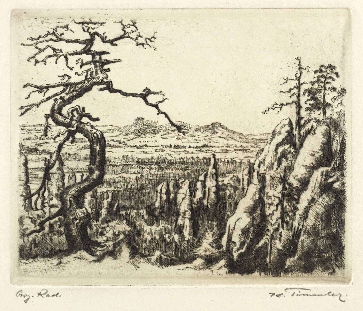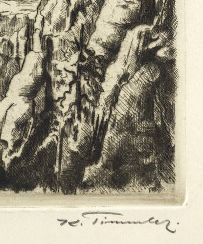 1952-1954. Radierung / Strichätzung, mit Plattenton, in Braunschwarz, auf gelbem Velinkarton. – Originale Künstlergrafik, von Karl Timmler. – 16,0 x 19,7 cm (Darstellung), 27 x 32 cm (Blatt).