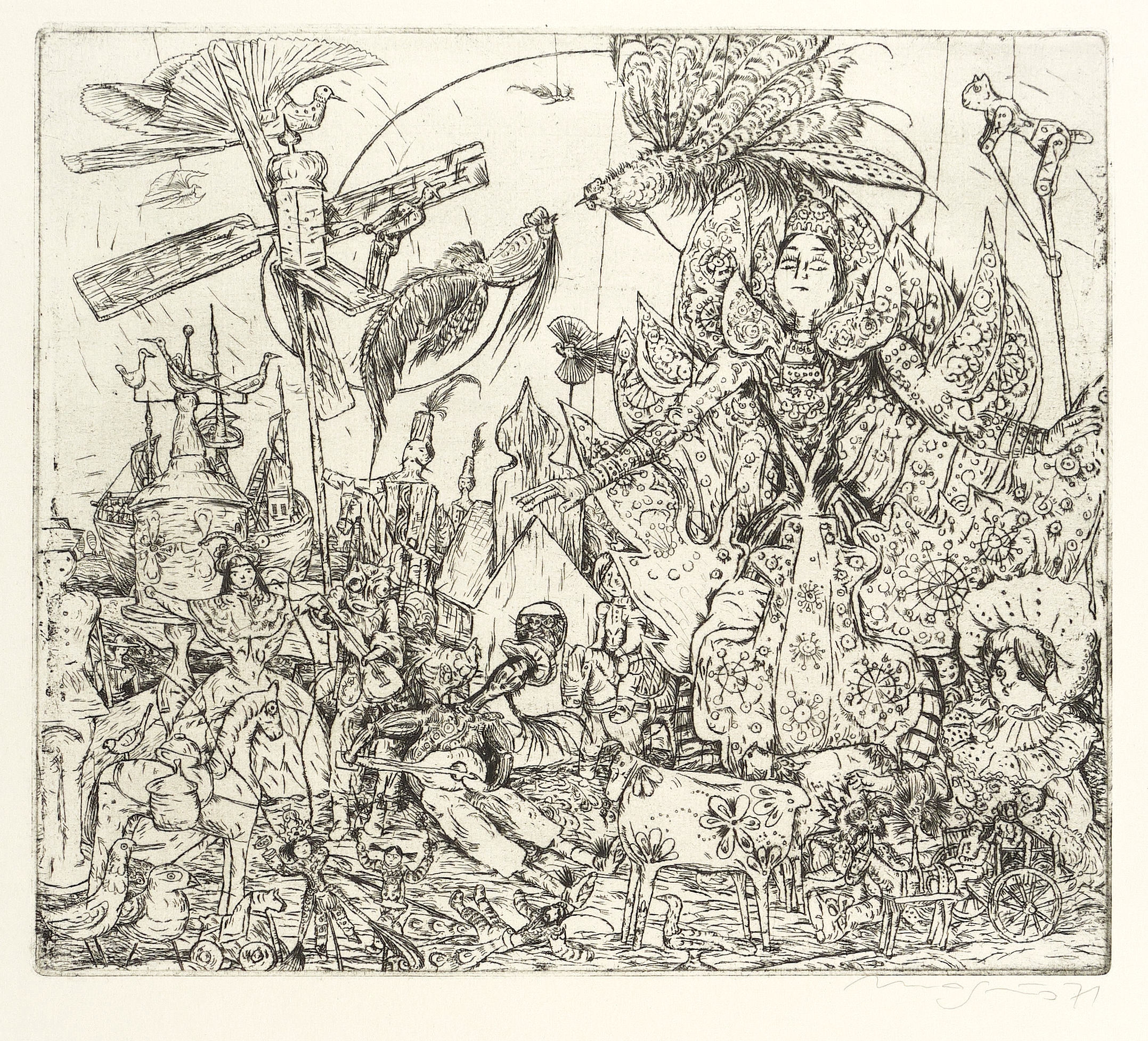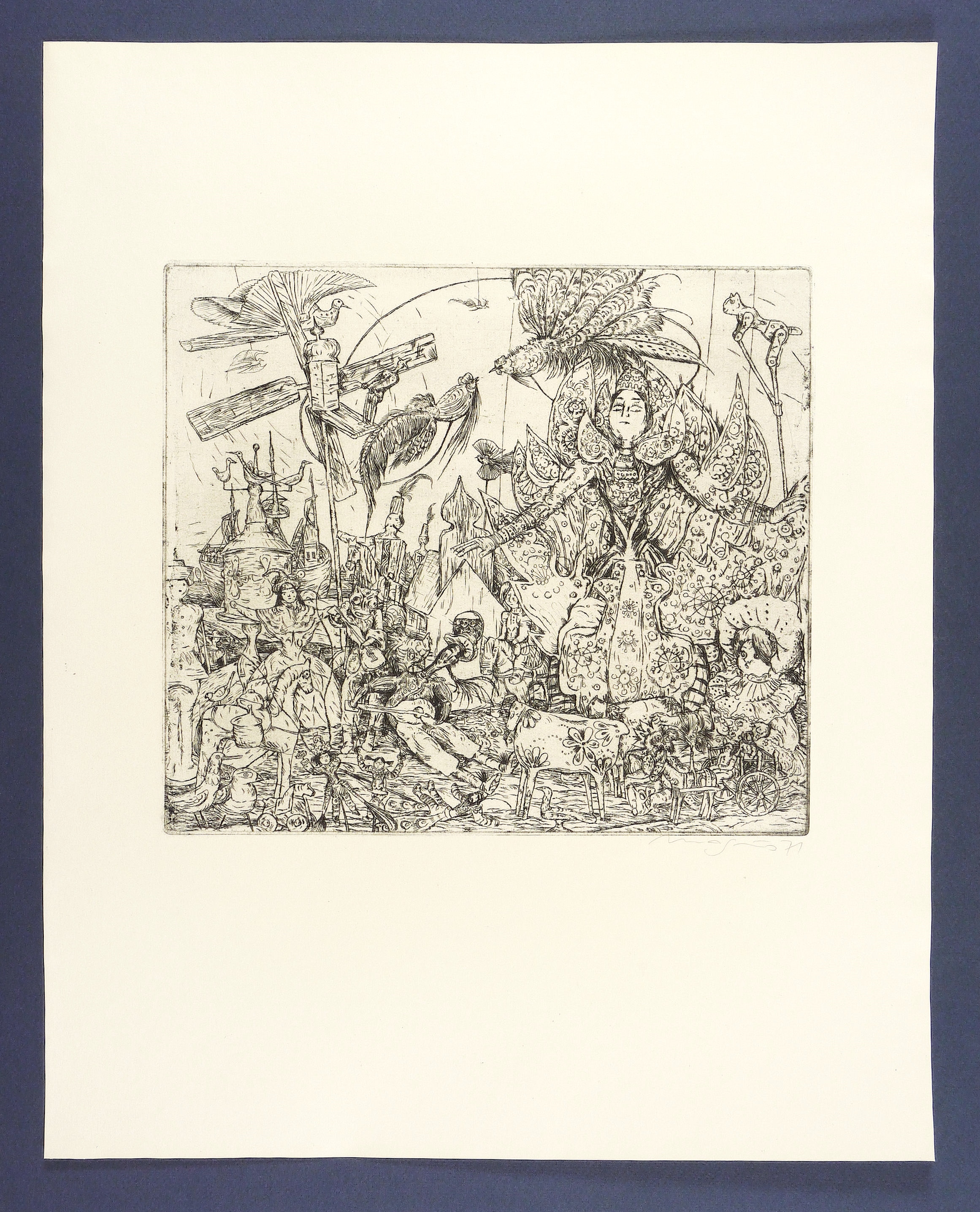 1971. Radierung / Strichätzung, in Schwarz, auf Weißenborn-Bütten. – Originale Künstlergrafik, von Klaus Magnus. – Auflage 100 Exemplare. – 25,3 x 28,9 cm (Darstellung / Platte), 50 x 40 cm (Blatt).