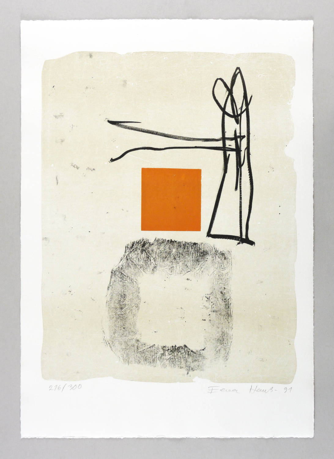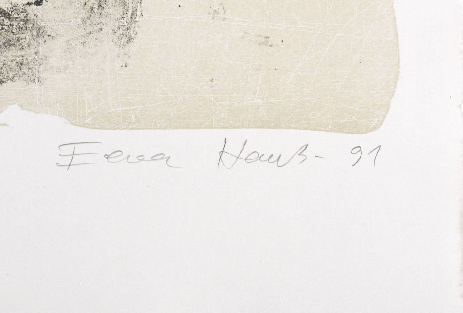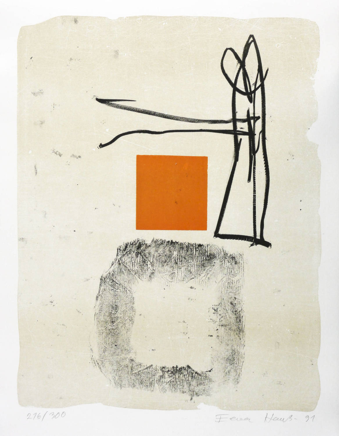 1991. Farblithografie / Pinsel- & Kreidelithografie, in 3 Farben, auf festem weißem Velin. – Originale Künstlergrafik, von Eeva Hauß. – Auflage Exemplar Nr. 216/300. – 47,5 x 36,5 cm (Darstellung / Druckbild), 60 x 42 cm (Blatt).