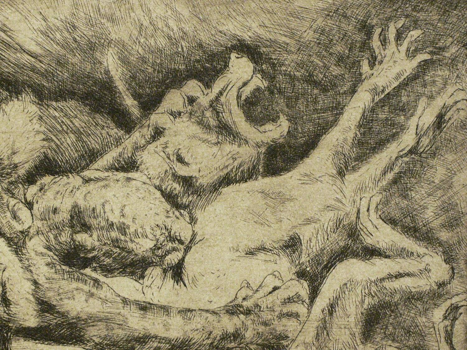 Um 1925. Radierung / Strichätzung, in Schwarz, auf gelblichem Velin. – Originale Künstlergrafik, von Friedrich Strüver. – 9,5 x 17,3 cm (Darstellung / Platte), 16 x 24 cm (Blatt).