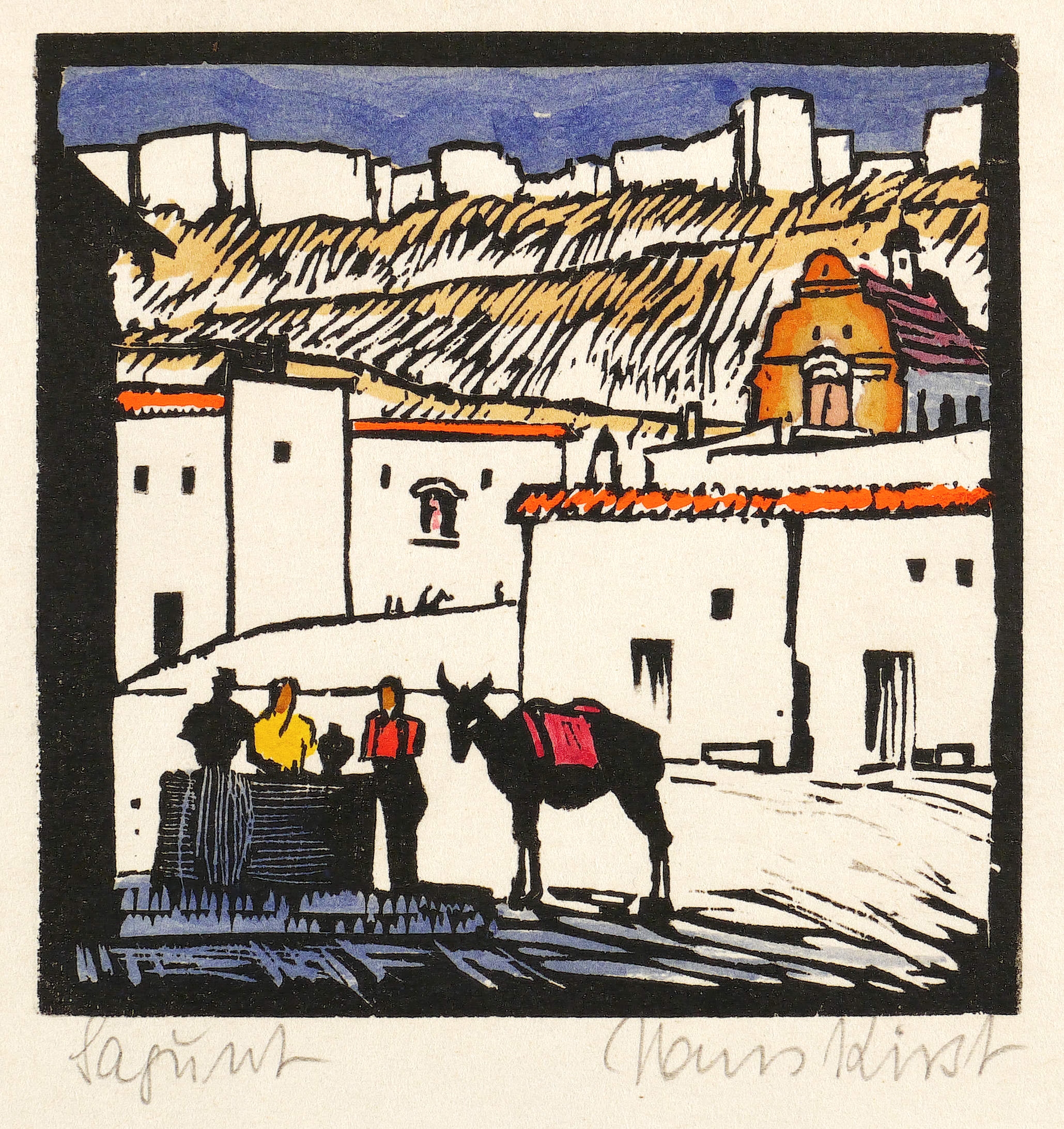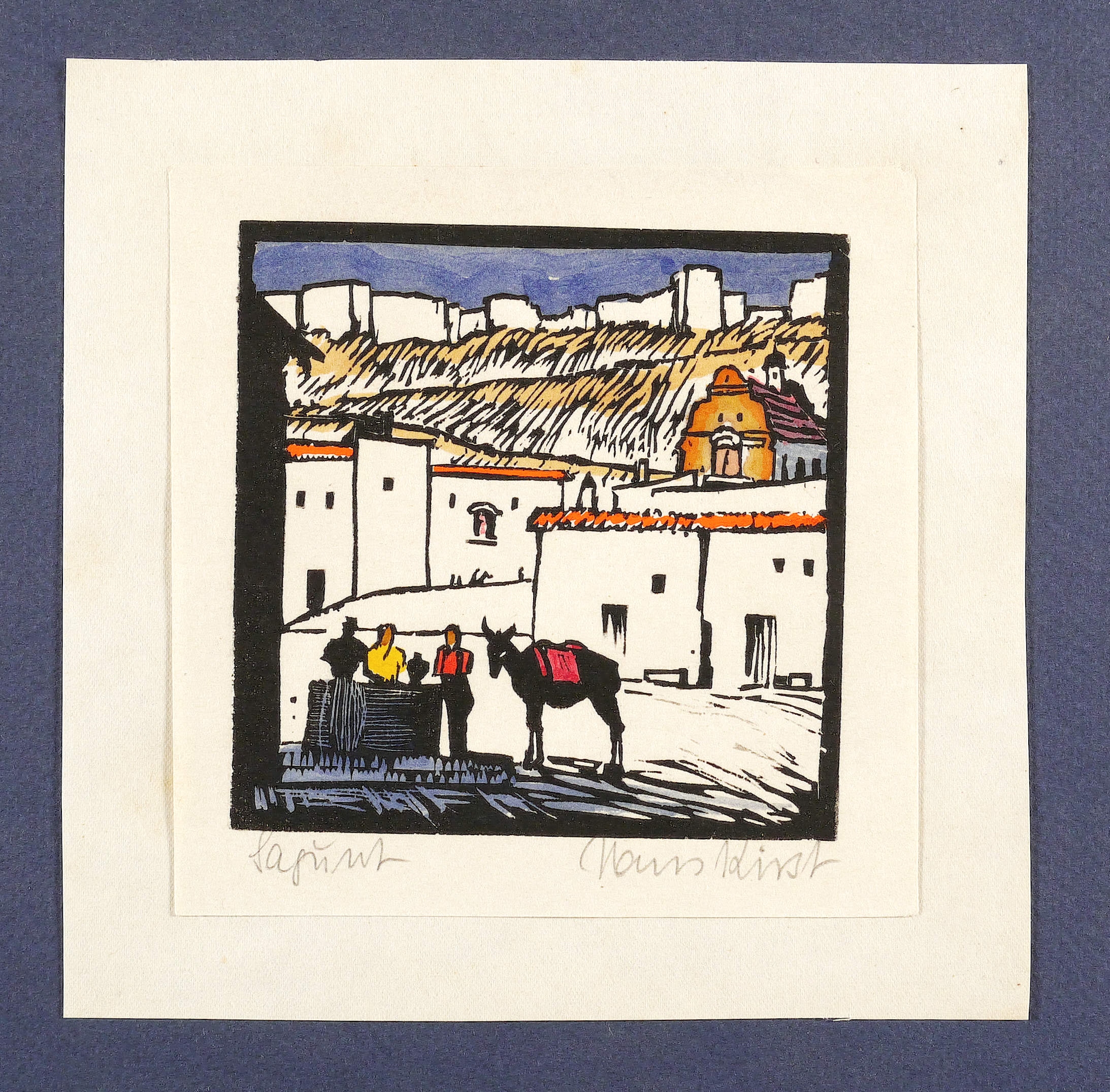 Um 1940. Holzschnitt, aquarelliert, auf Papier. – Originale Künstlergrafik, von Hans Kirst. – 9,0 x 9,1 cm (Darstellung / Druckstock), 11 x 11 cm (Blatt), 14,5 x 14,5 cm (Trägerblatt).
