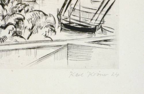 1924. Radierung / Kaltnadel, in Schwarz, auf gelblichem Velin. – Originale Künstlergrafik, von Karl Kröner. – 20,0 x 30,0 cm (Darstellung / Platte), 38 x 53 cm (Blatt).