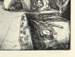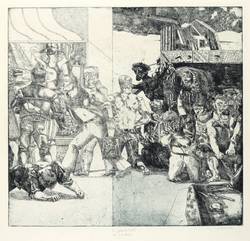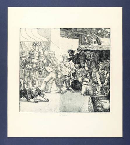 Ulrich Hachulla (*1943 Heydebreck / Oberschlesien, lebt und arbeitet in Leipzig). Deutscher Maler und Grafiker, namhafter Vertreter der sog. Leipziger Schule. Ab 1950 Zeichenunterricht bei dem Max-Liebermann-Schüler Hanns Markowski in Halle. 1963-68 Grundstudium an der Hochschule für Grafik und Buchkunst (HGB) in Leipzig bei Werner Tübke, Hans Mayer-Foreyt und Harry Blume. Dann bei Bernhard Heisig in der Fachklasse für Malerei und Freie Grafik. Ab 1968 freischaffend. 1972-74 Aspirantur und Meisterstudium bei Werner Tübke. 1974-76 Lehrauftrag, ab 1976 Leitung der Werkstatt für Radierung an der HGB. Seit 1978 Dozent, seit 1993 Professur für Radierung ebenda. Ab 2002 und bis zur Emeritierung 2008 Leitung der Grafikklasse der HGB.