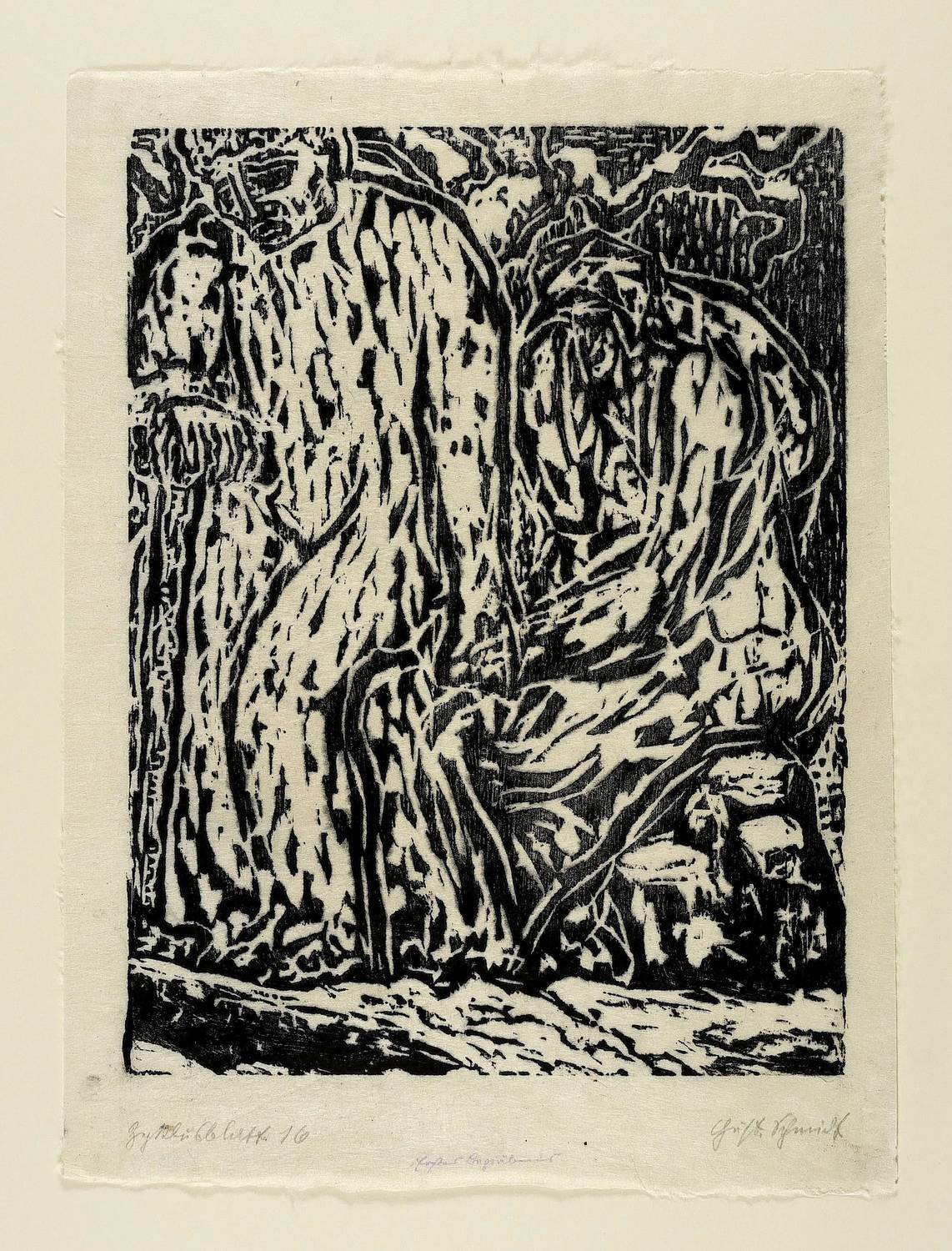 Um 1920. Holzschnitt, in Schwarz, auf grobfasrigem Japan. – Originale Künstlergrafik, von Gustav Schmidt. – 32,0 x 24,3 cm (Darstellung / Druckstock), 38 x 28 cm (Blatt).