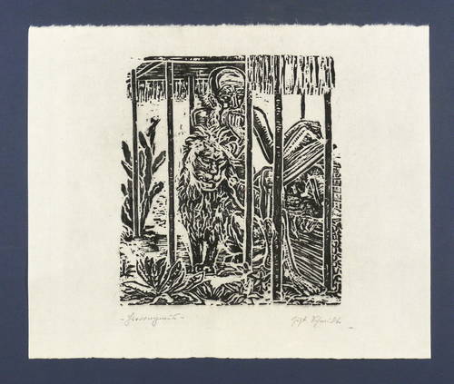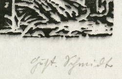 Gustav Schmidt (1888 Peine - 1972 Dresden). Deutscher Maler, Grafiker, Bildhauer und Keramiker. Namhafter Vertreter des expressiven und kritischen Realismus. Studium an der Akademie in Dresden bei Robert Sterl und Carl Bantzer. 1911-13 Meisterschüler bei Otto Gußmann. Als Soldat im Ersten Weltkrieg schwer verwundet kehrte er 1917 als Zeichenlehrer ans Realgymnasium Peine zurück. Seit 1919 als freischaffender Künstler in Dresden. Widmete sich vor allem antiken und biblischen Bildthemen. Sein Werk umfasst Gemälde, Zeichungen sowie druckgrafische Blätter in Holzschnitt und Gipshochdruck, so z.B. die Grafikfolgen "Passion Christi" und "Die ersten Menschen".