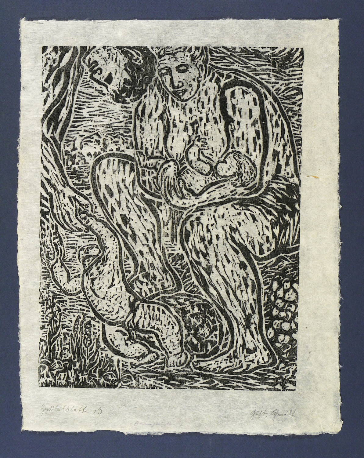 Gustav Schmidt (1888 Peine - 1972 Dresden). Deutscher Maler, Grafiker, Bildhauer und Keramiker. Namhafter Vertreter des expressiven und kritischen Realismus. Studium an der Akademie in Dresden bei Robert Sterl und Carl Bantzer. 1911-13 Meisterschüler bei Otto Gußmann. Als Soldat im Ersten Weltkrieg schwer verwundet kehrte er 1917 als Zeichenlehrer ans Realgymnasium Peine zurück. Seit 1919 als freischaffender Künstler in Dresden. Widmete sich vor allem antiken und biblischen Bildthemen. Sein Werk umfasst Gemälde, Zeichungen sowie druckgrafische Blätter in Holzschnitt und Gipshochdruck, so z.B. die Grafikfolgen "Passion Christi" und "Die ersten Menschen".