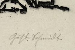 Gustav Schmidt (1888 Peine - 1972 Dresden). Deutscher Maler, Grafiker, Bildhauer und Keramiker. Namhafter Vertreter des expressiven und kritischen Realismus. Studium an der Akademie in Dresden bei Robert Sterl und Carl Bantzer. 1911-13 Meisterschüler bei Otto Gußmann. Als Soldat im Ersten Weltkrieg schwer verwundet kehrte er 1917 als Zeichenlehrer ans Realgymnasium Peine zurück. Seit 1919 als freischaffender Künstler in Dresden. Widmete sich vor allem antiken und biblischen Bildthemen. Sein Werk umfasst Gemälde, Zeichungen sowie druckgrafische Blätter in Holzschnitt und Gipshochdruck, so z.B. die Grafikfolgen "Passion Christi" und "Die ersten Menschen".