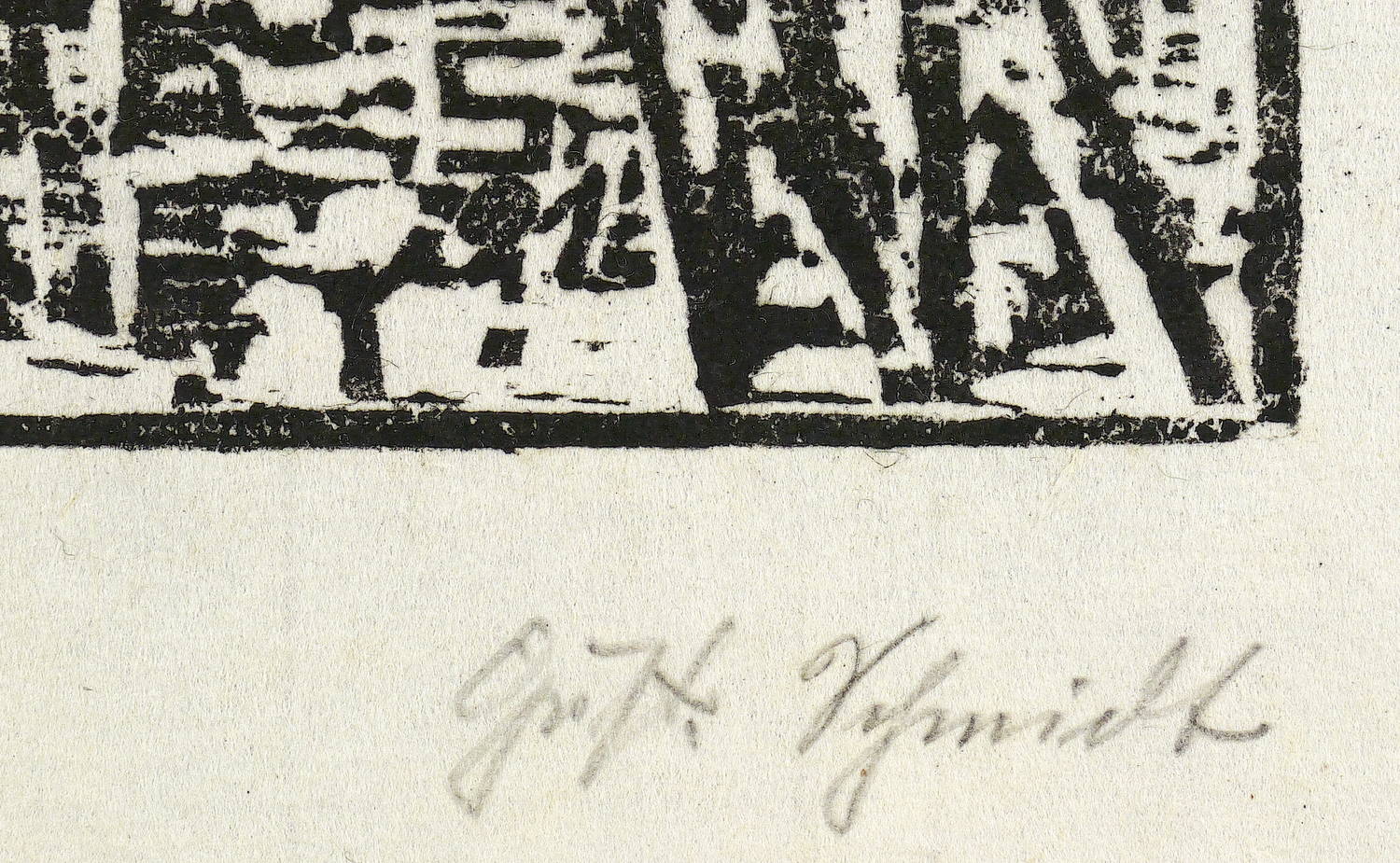 1921. Holzschnitt, in Schwarz, auf rauem gelblichem Japanbütten. – Originale Künstlergrafik, von Gustav Schmidt. – 24,4 x 31,9 cm (Darstellung / Druckstock), 33 x 49 cm (Blatt).