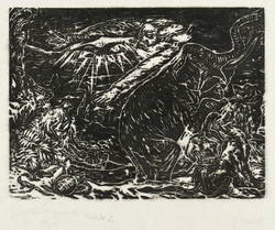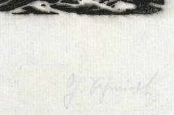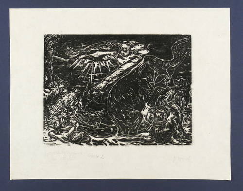 Rechts unten in Bleistift signiert. Links betitelt sowie bezeichnet: ″Zyklusblattholzschnitt 2″. – Druckfarbe im Druckprozess original etwas verlaufen. Insgesamt guter Zustand.