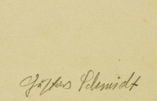 Gustav Schmidt (1888 Peine - 1972 Dresden). Deutscher Maler, Grafiker, Bildhauer und Keramiker. Namhafter Vertreter des expressiven und kritischen Realismus. Studium an der Akademie in Dresden bei Robert Sterl und Carl Bantzer. 1911-13 Meisterschüler bei Otto Gußmann. Als Soldat im Ersten Weltkrieg schwer verwundet kehrte er 1917 als Zeichenlehrer ans Realgymnasium Peine zurück. Seit 1919 als freischaffender Künstler in Dresden. Widmete sich vor allem antiken und biblischen Bildthemen. Sein Werk umfasst Gemälde, Zeichungen sowie druckgrafische Blätter in Holzschnitt und Gipshochdruck, so z.B. die Grafikfolgen "Passion Christi" und "Die ersten Menschen".
