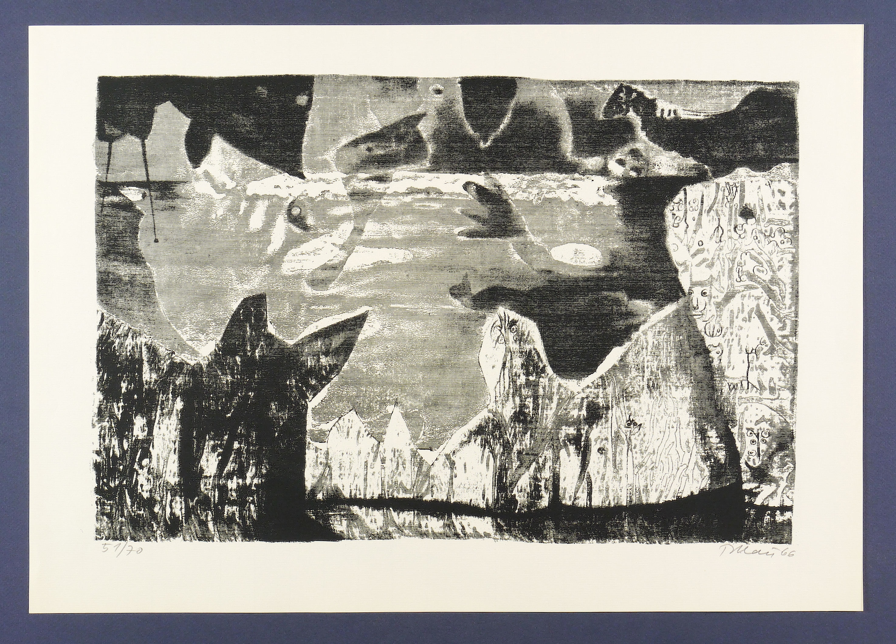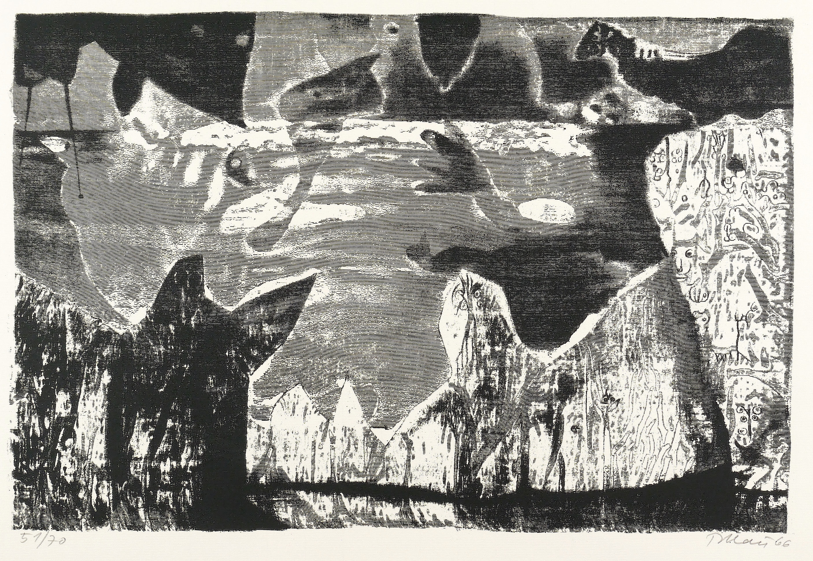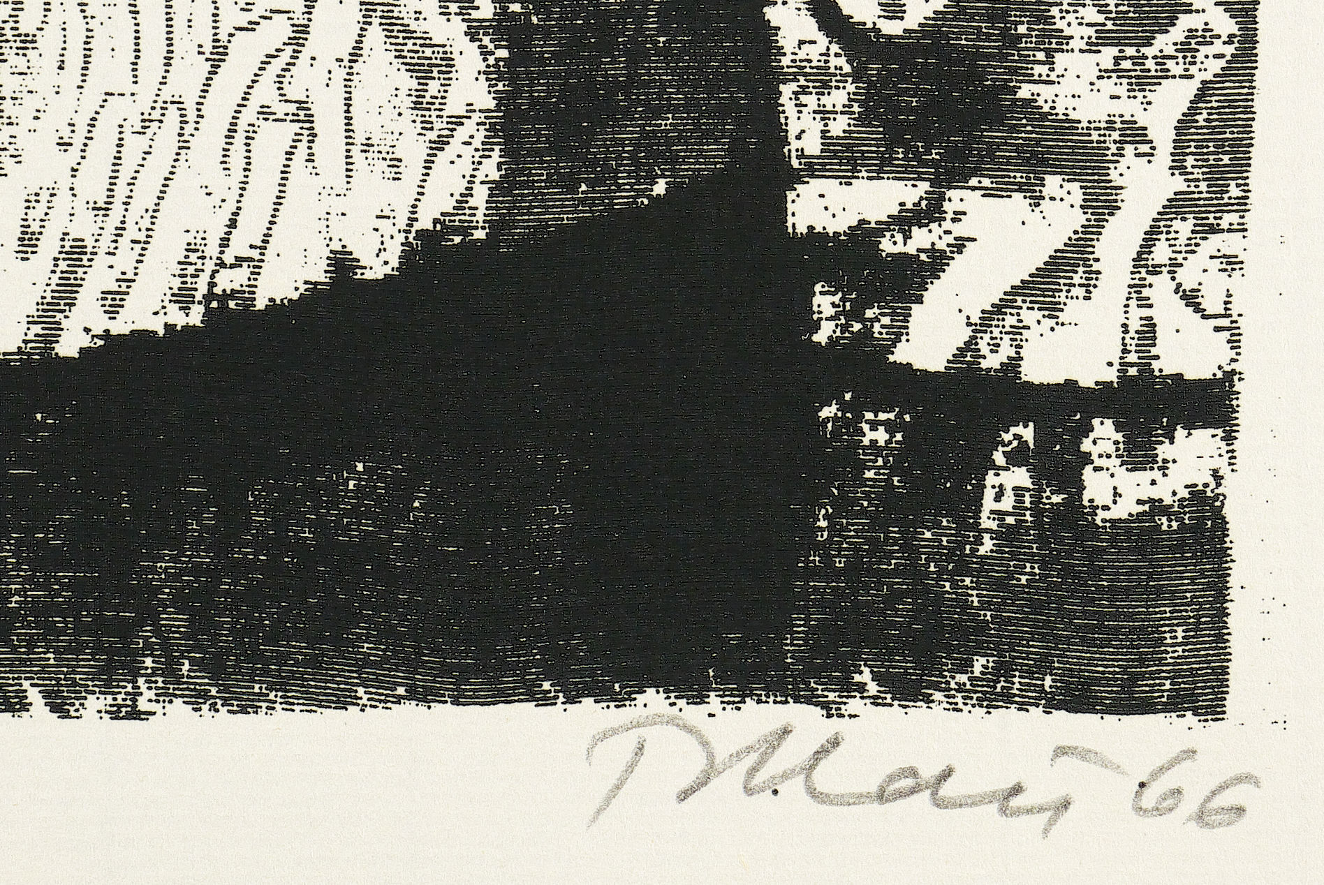 1966. Siebdruck / Serigrafie, in Schwarz, auf chamoisfarbenem Maschinenbütten. – Originale Künstlergrafik, von Toni Mau. – Auflage Exemplar Nr. 51/70. – 32,8 x 49,7 cm (Darstellung / Druckbild), 42 x 59 cm (Blatt).