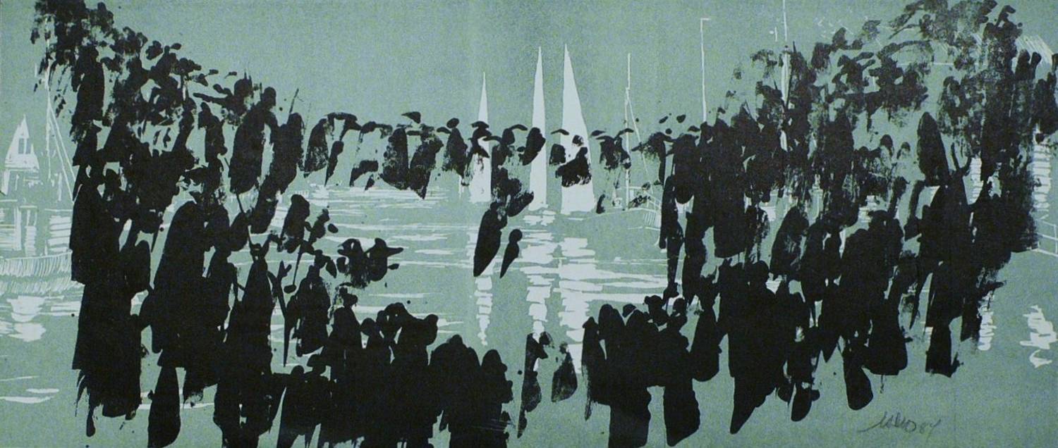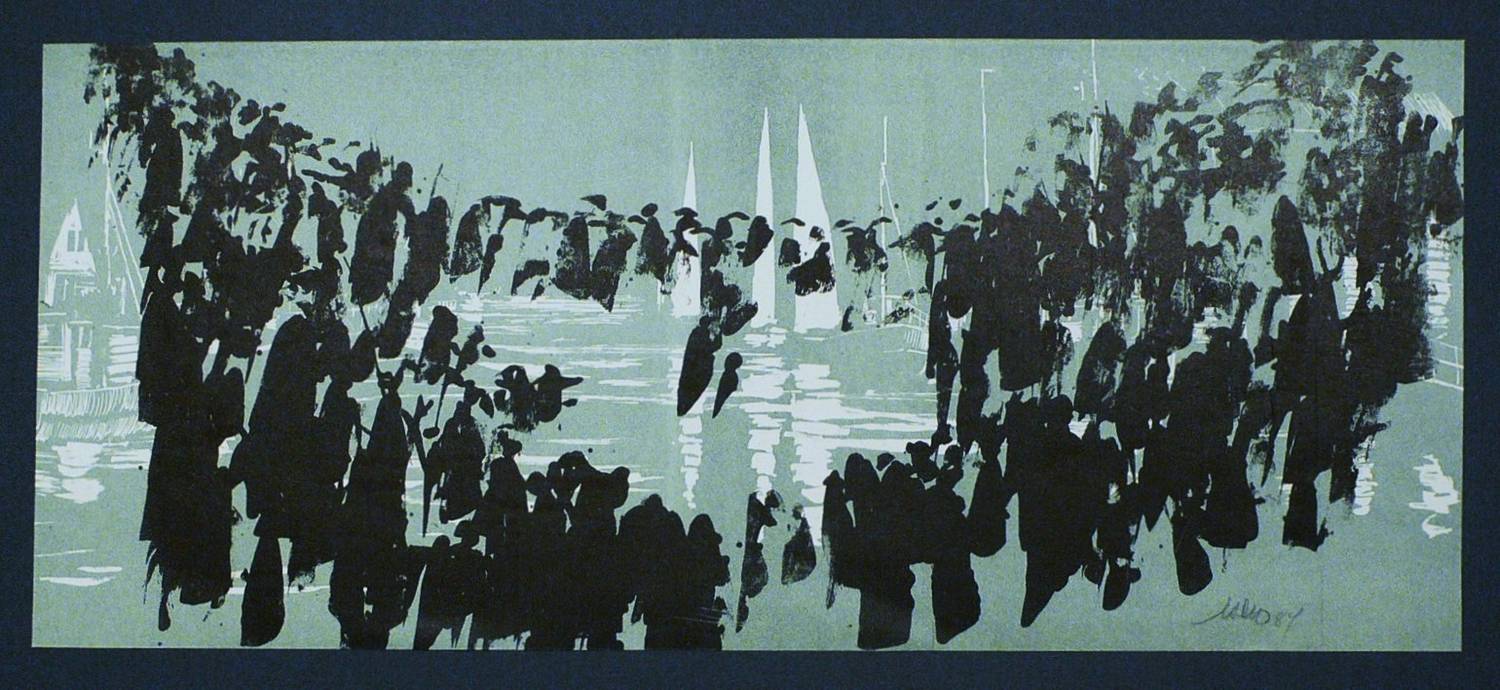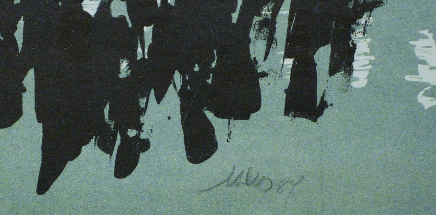 1984. Farblithografie, in Schwarz & Grünblau, auf hellchamois Velinkarton. – Originale Künstlergrafik, von Hans Peter Kohde. – 18,5 x 43,8 cm (Darstellung / Einfassungslinie).