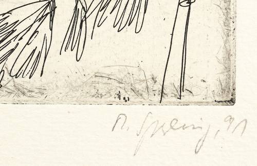 1991. Radierung / Strichätzung, in Schwarz, auf hellgelbem Maschinenbütten. – Originale Künstlergrafik, von Margot Sperling. – 10,6 x 16,4 cm (Darstellung / Platte), 19 x 24 cm (Blatt).