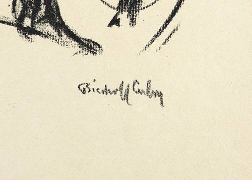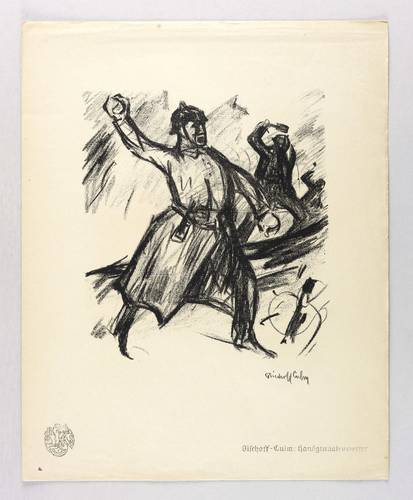 Aus: Krieg und Kunst. Original-Steinzeichnungen der Berliner Sezession (Berlin: Julius Bard 1917). – Nicht handsigniert. Im Stein signiert rechts unten: ″Bischoff Culm″. Außerhalb des Steins typografisch bezeichnet und betitelt unten rechts: ″Bischoff-Culm: Handgranatenwerfer″. Links unten Vignette der Berliner Sezession. – Originalrandiges Exemplar. Papier etwas gegilbt. Leichte Randmängel, Ecke links unten mit kleinem Löchlein. Mäßig guter Zustand.