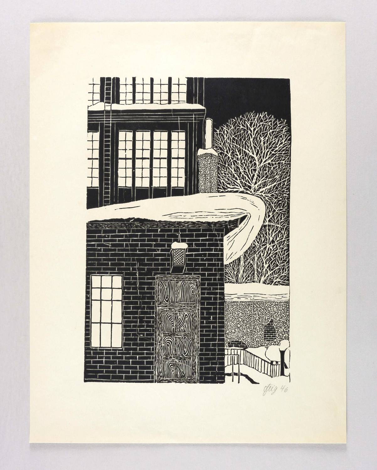 Rechts unten in Bleistift signiert und datiert: ″Fleig 46″. – Aus einer Mappe ″12 Linolschnitte″ der Graphikklasse von Prof. Eduard Ege an der Meisterschule für Deutschlands Buchdrucker in München 1946. – Insgesamt guter Zustand.