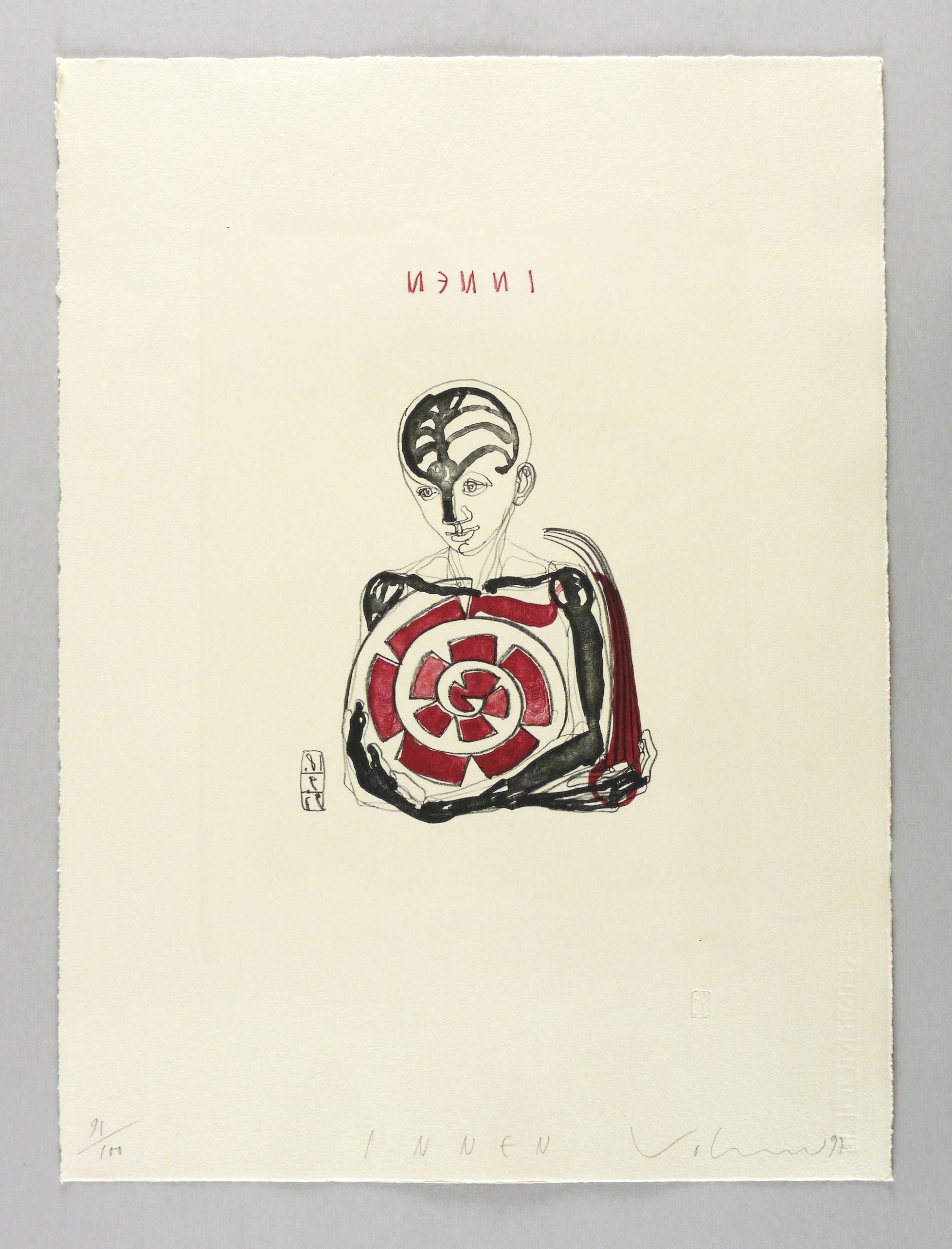 1997. Farblithografie / Kreide- & Pinsellithografie, in Dunkelrot & Schwarz, auf chamois Hahnemühle. – Originale Künstlergrafik, von Steffen Volmer. – Auflage Exemplar Nr. 91/100. – 26,4 x 17,1 cm (Darstellung / mit Schrift), 54 x 40 cm (Blatt).