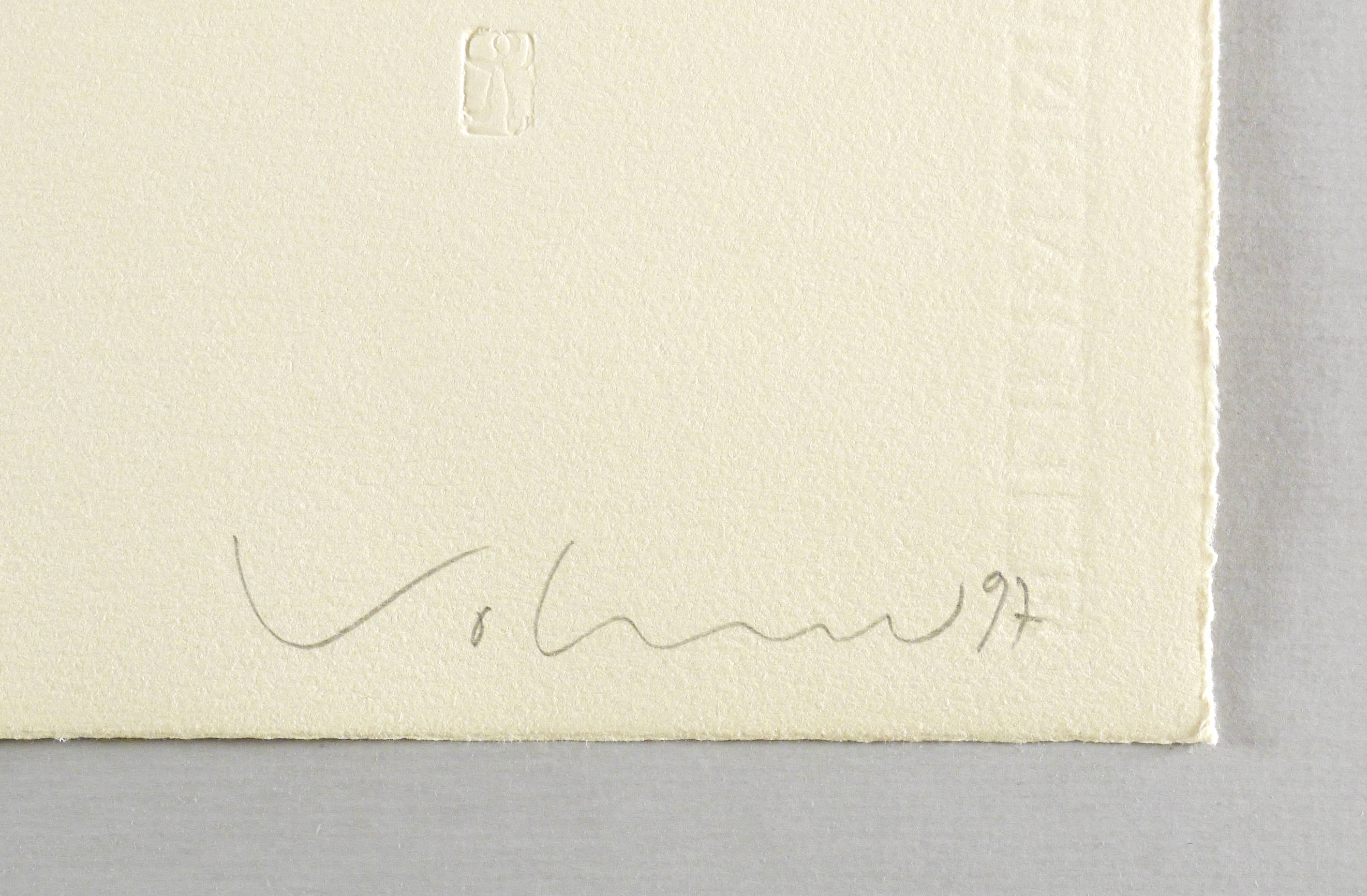 Rechts unten in Bleistift signiert und datiert. Links Auflagenbezeichnung. Mittig Titel. Im Stein oben spiegelschriftlich Titel, links unten Datum. Trockenstempel mit Künstlersignet. Wasserzeichen der Hahnemühle. – Tadellos. Sehr guter Zustand.