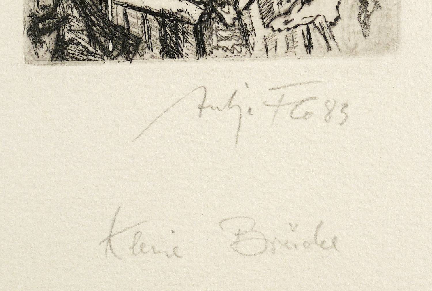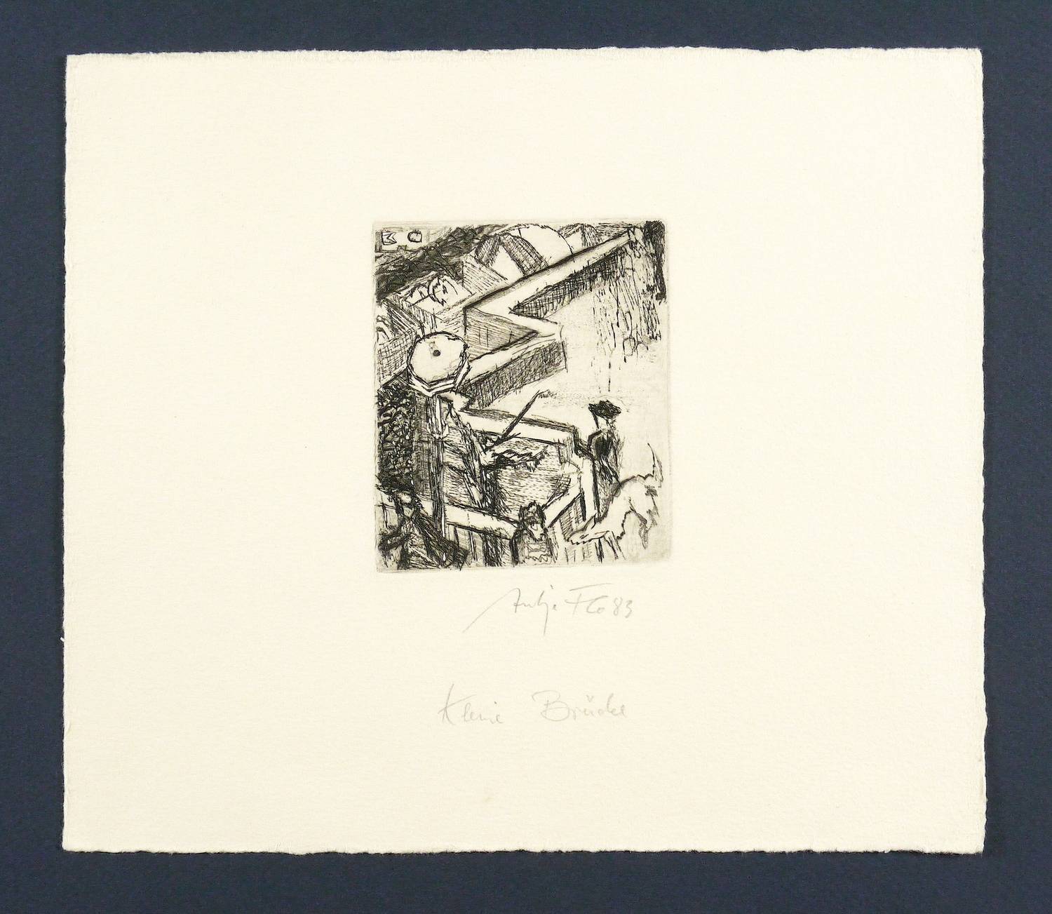 1983. Radierung / Strichätzung, in Schwarz, auf hellchamois Velin. – Originale Künstlergrafik, von Antje Fretwurst-Colberg. – 8,6 x 7,2 cm (Darstellung / Platte), 20 x 22,5 cm (Blatt).