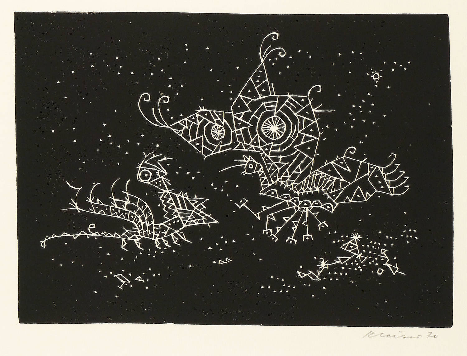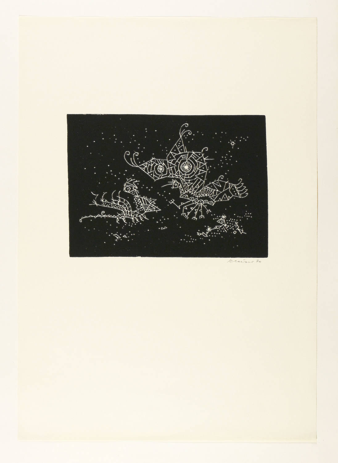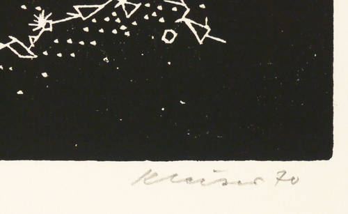 1970. Holzschnitt / Weißlinienschnitt, in Schwarz, auf chamois Achat-Bütten. – Originale Künstlergrafik, von Helmut Kleiser. – Auflage Exemplar Nr. 31/70. – 20,0 x 28,1 cm (Darstellung / Druckbild), 61 x 42 cm (Blatt).