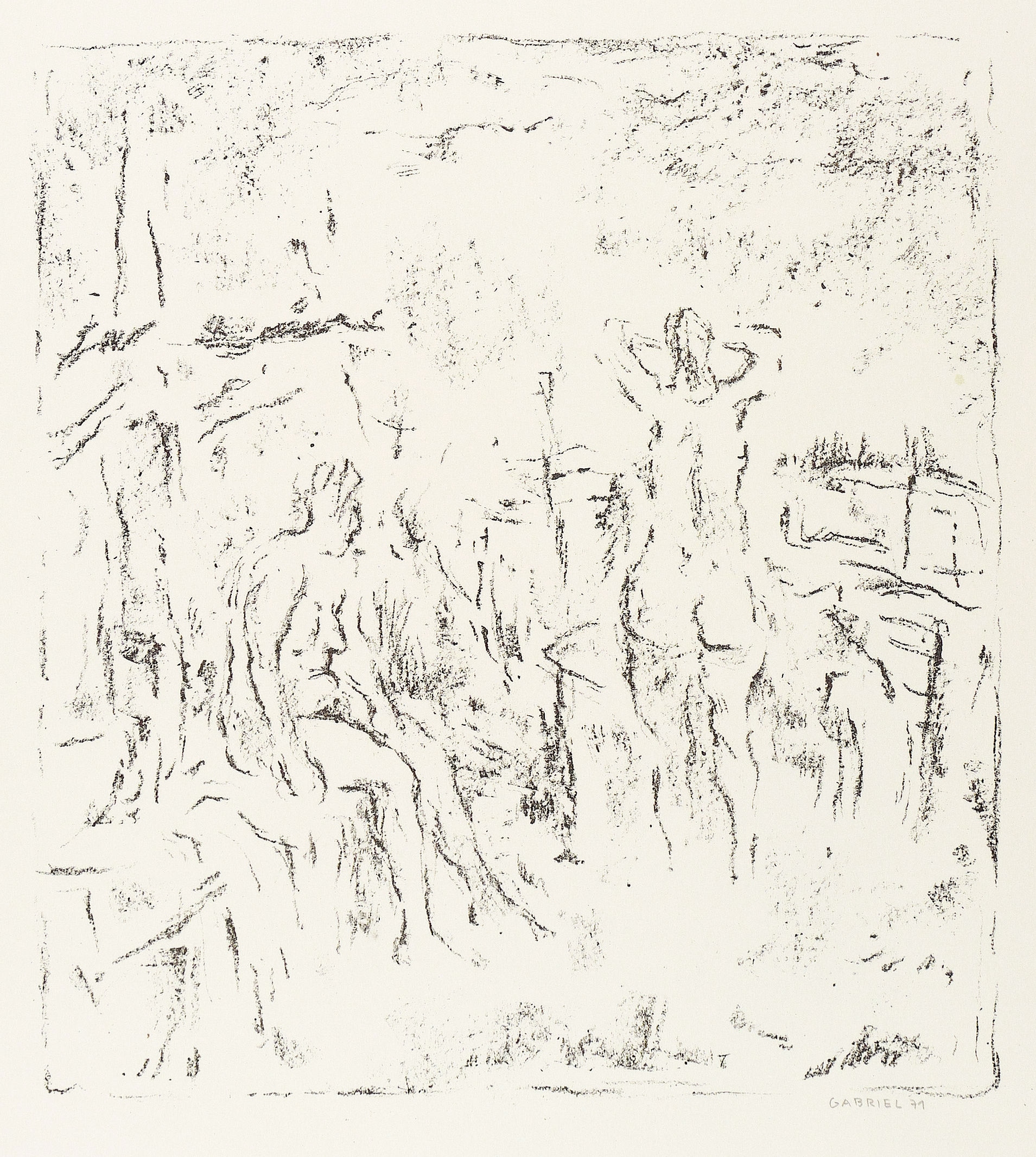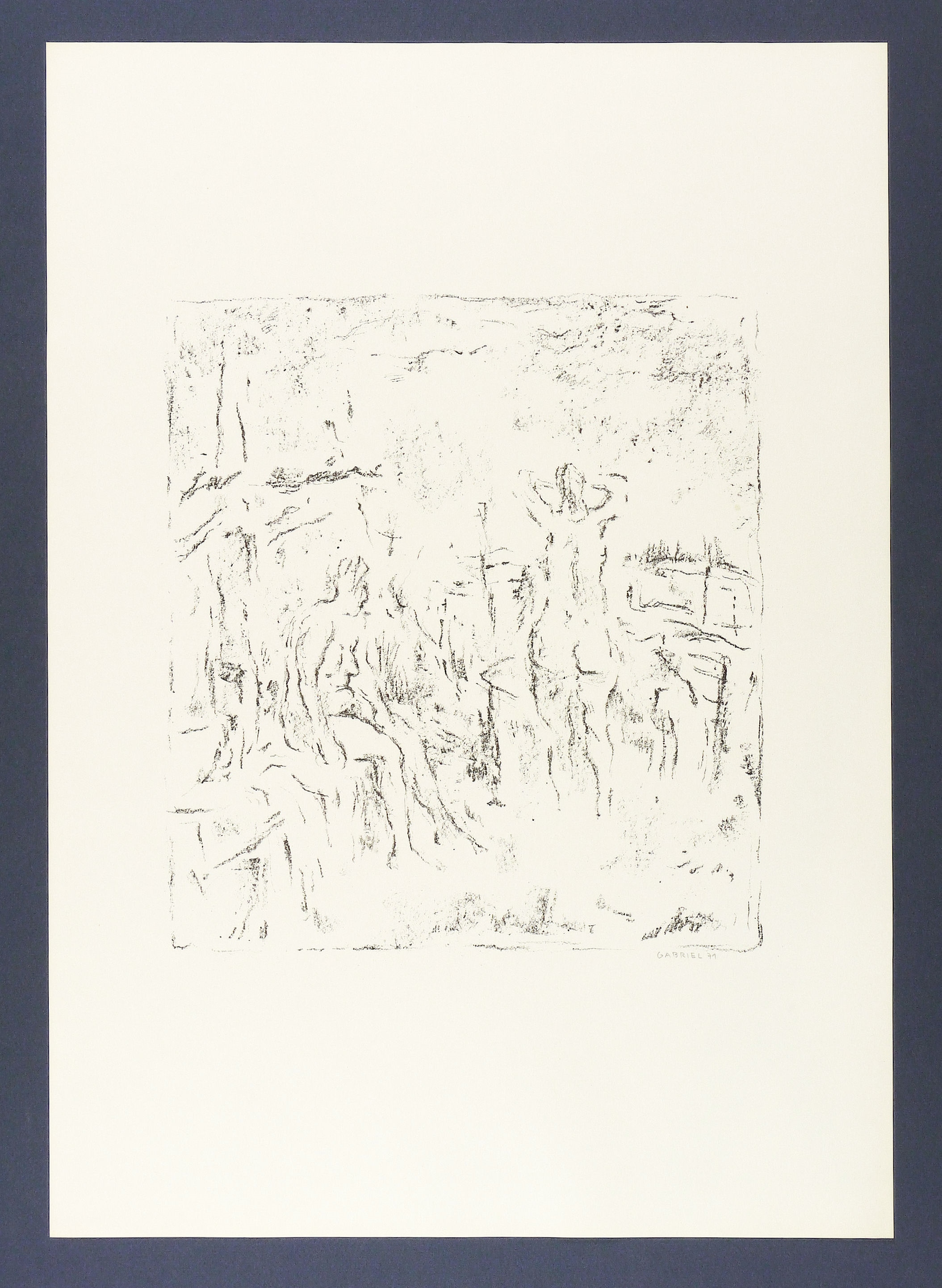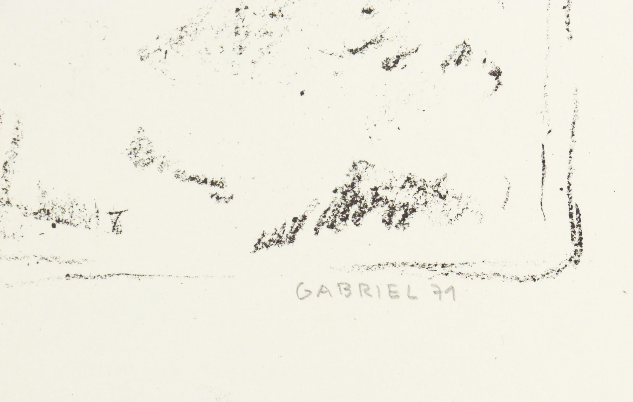 1971. Lithografie / Kreidelithografie, in Schwarz, auf weißem Karton. – Originale Künstlergrafik, von Manfred Gabriel. – Auflage Exemplar Nr. 32/70. – 33 x 29,5 cm (Darstellung), 59 x 42 cm (Blatt).