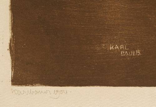 Links unten in Bleistift signiert und datiert: ″Karl Bauer 1904″. Rechts Titel. Im Stein unten Ritzsignatur: ″KARL BAUER″. – Leichte Knickspur im Rand links oben. Sonst sehr gut erhalten.