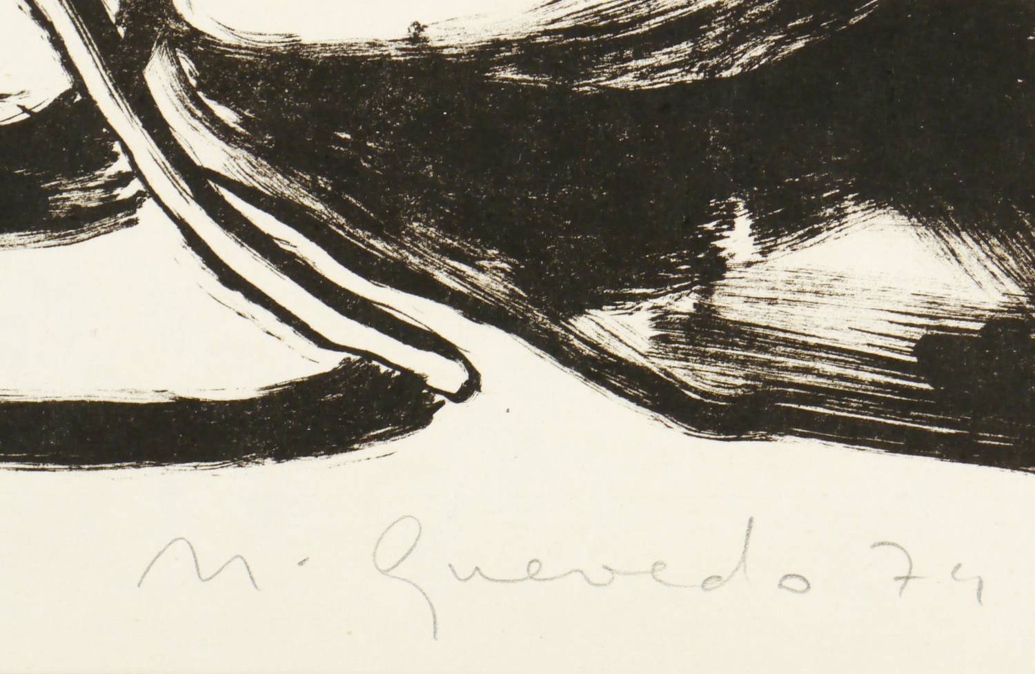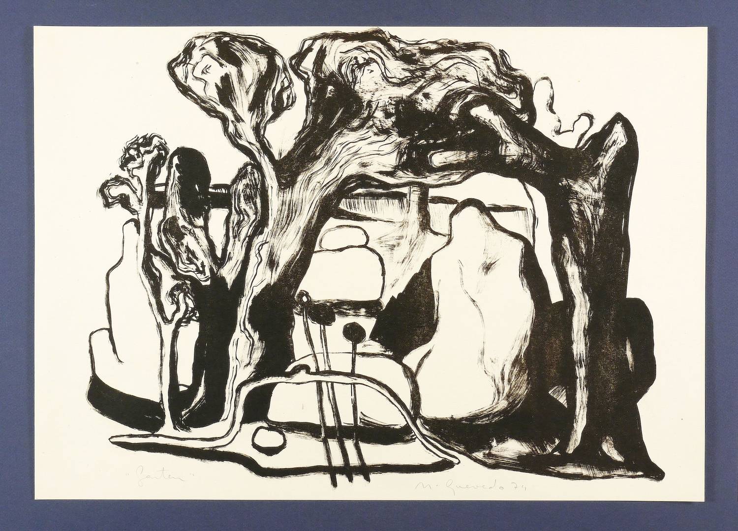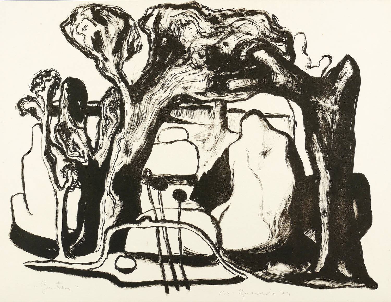1974. Lithografie / Pinsellithografie, in Schwarz, auf hellchamois Karton. – Originale Künstlergrafik, von Nuria Quevedo. – Auflage Exemplar Nr. 44/100. – 40,7 x 51,4 cm (Darstellung / Druckbild), 42 x 60 cm (Blatt).
