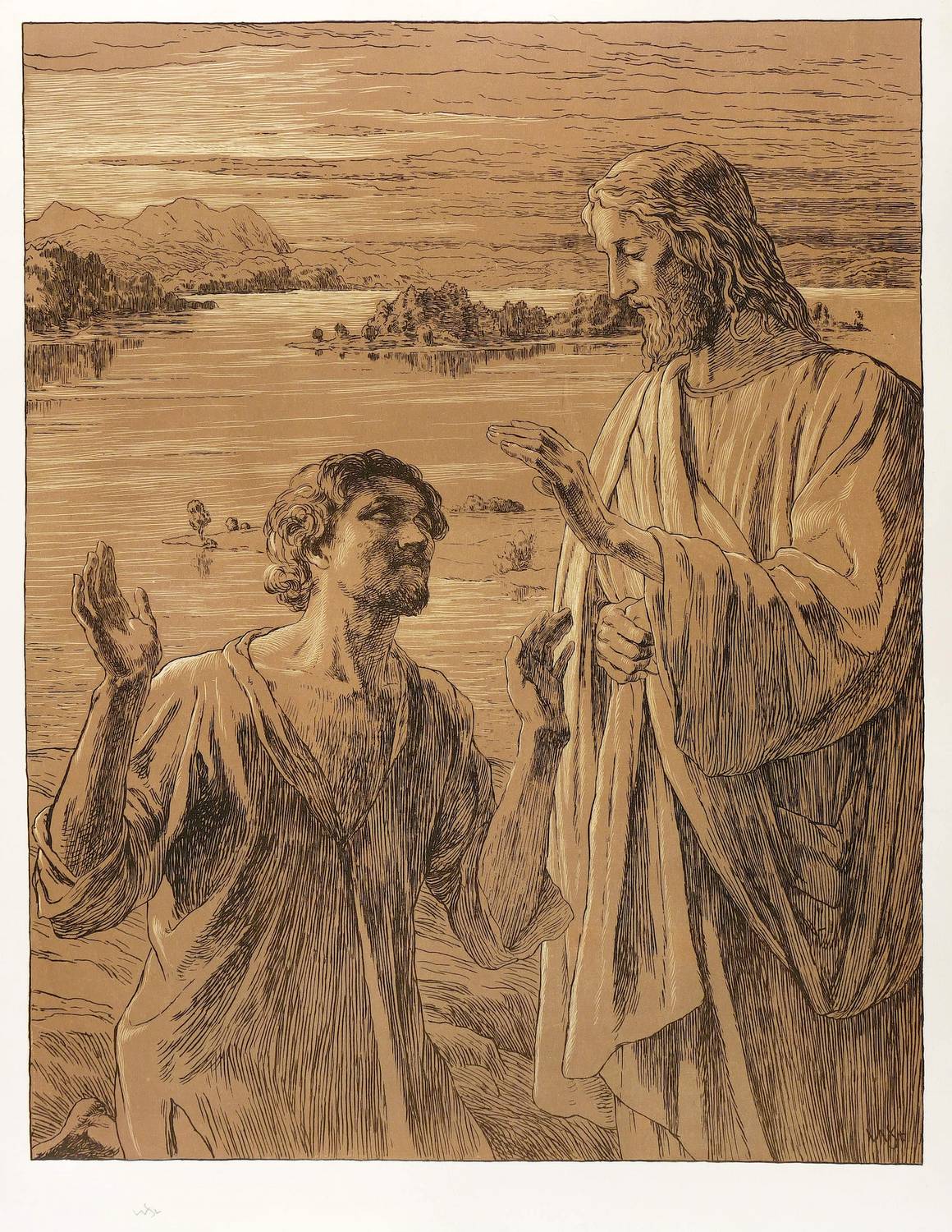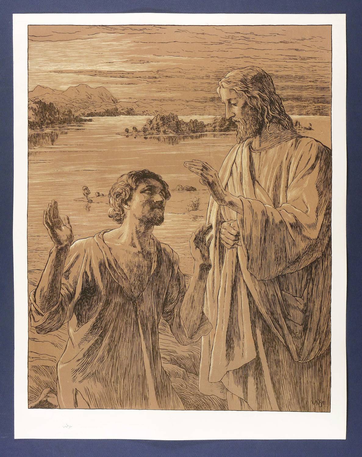 Um 1890. Farblithografie / Federlithografie, in Braun & Schwarz, auf Karton. – Originale Künstlergrafik, von Wilhelm Steinhausen. – 55,3 x 43,6 cm (Darstellung / Druckbild), 61 x 48 cm (Blatt).