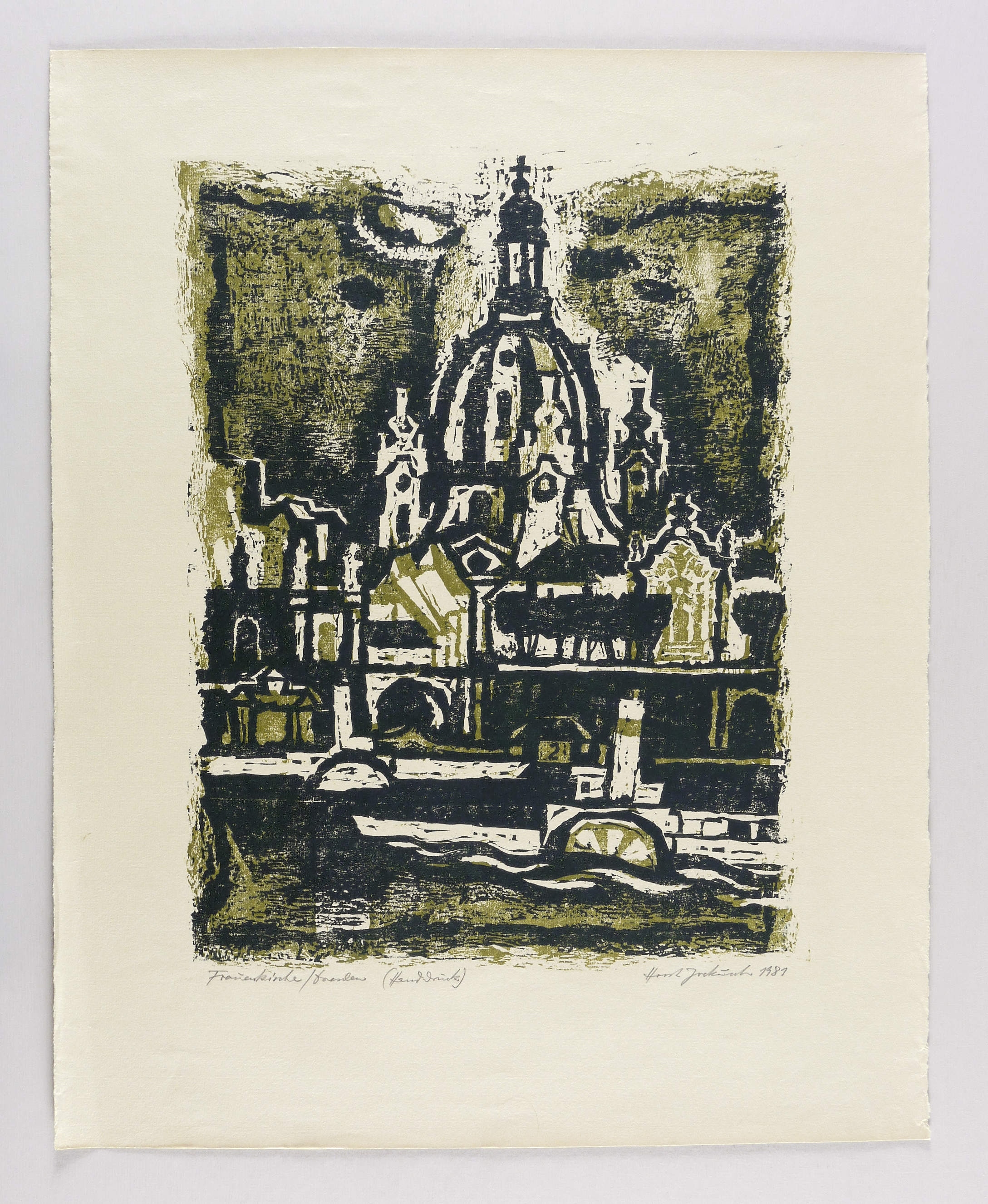 In Bleistift rechts unten signiert und datiert: ″Horst Jockusch 1981″. Links Titel: ″Frauenkirchen / Dresden″. Mittig bezeichnet: ″Handdruck″. Wasserzeichen. – Unscheoinbare Knickspuren in der linken unteren Blattecke. Sonst sehr guter Zustand.