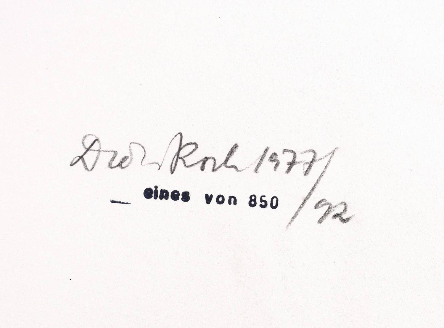 Griffelkunst 263 C5. – Rechts unten in Bleistift signiert und datiert: ″Dieter Roth 1977/92″. Dazu stempelschriftliche Auflagenbezeichnung. – Mit zahlreichen absichtsvoll gesetzten Fingerflecken in Druckfarbe im Blattrand zur Kennzeichnung des Druckprozesses. – Sehr guter Zustand.