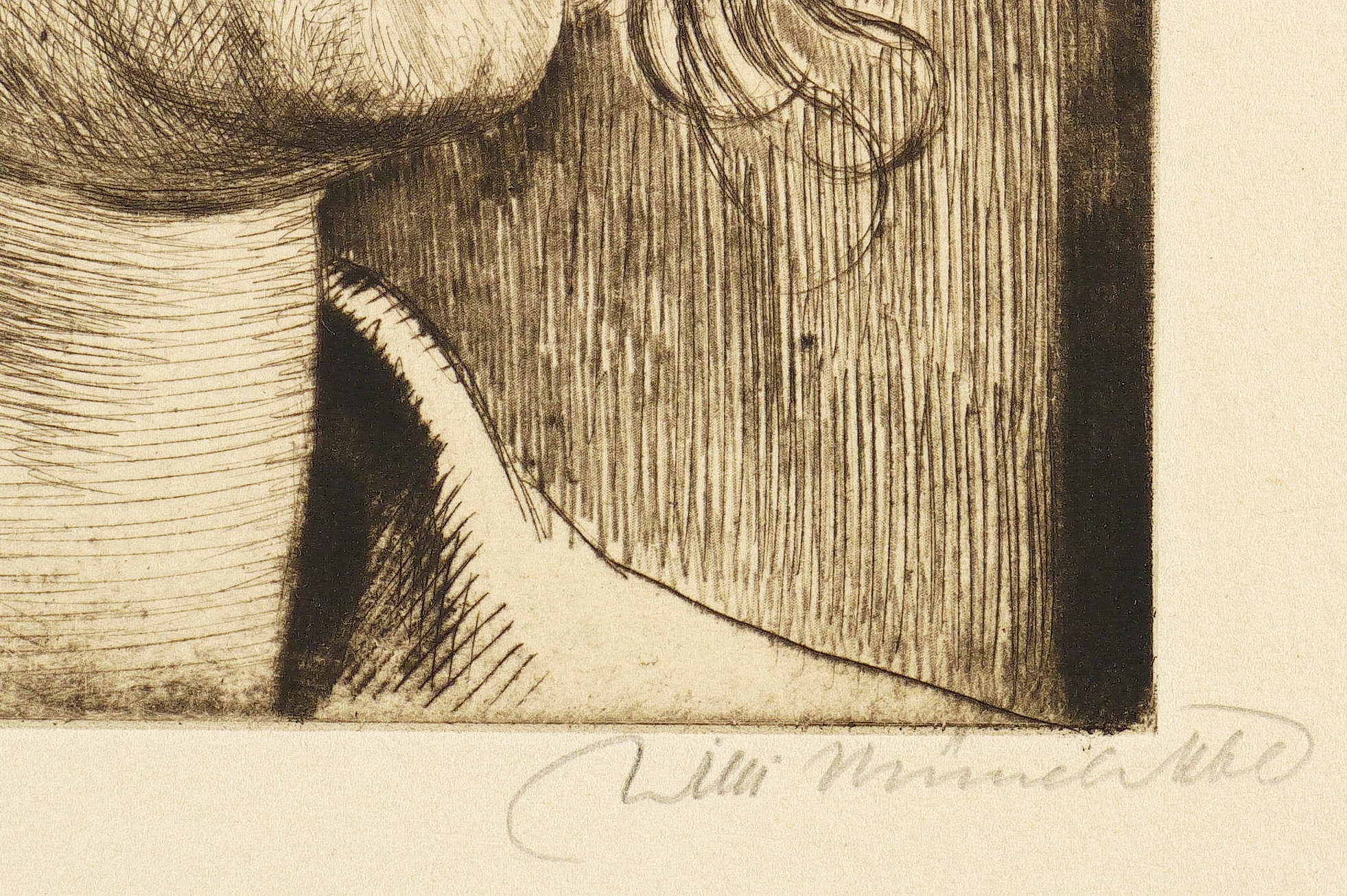 Um 1920. Radierung / Strichätzung & Kaltnadel, in Schwarz, auf gelbem Kupferdruckkarton. – Originale Künstlergrafik, von Willi Münch-Khe. – 21,6 x 17,5 cm (Darstellung / Platte), 35 x 28 cm (Blatt).