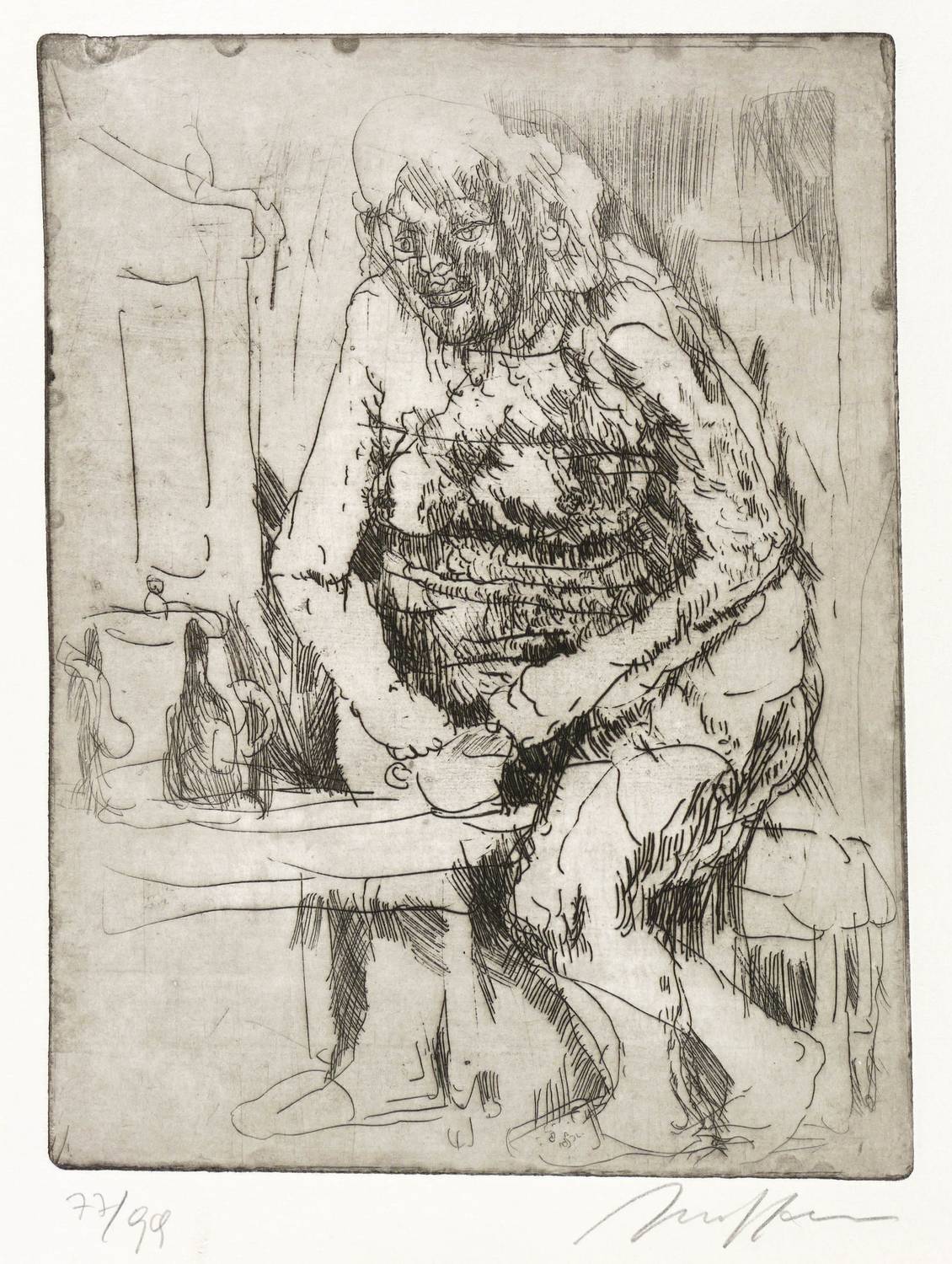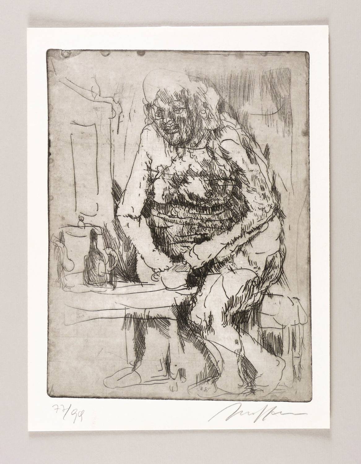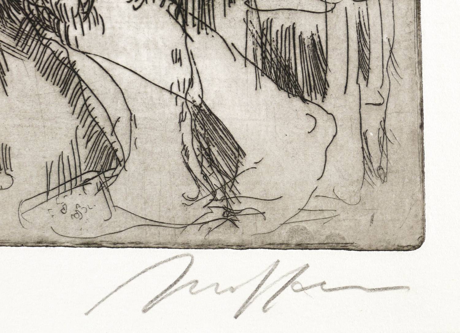 1962. Radierung / Strichätzung, in Schwarz, mit Plattenton, auf Büttenpapier. – Originale Künstlergrafik, von Alfred Hrdlicka. – Auflage Exemplar Nr. 77/99. – 27,3 x 20,5 cm (Darstellung / Platte), 32 x 24 cm (Blatt).