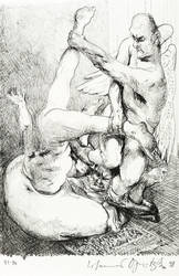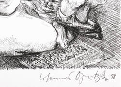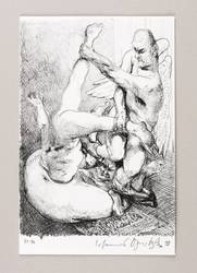 1998. Lithografie / Kreidelithografie, in Schwarz, auf hellchamois Velin. – Von Johannes Grützke. – Auflage Exemplar Nr. 41/90. – 17,5 x 12,5 cm (Darstellung / Druckbild), 19 x 12,5 cm (Blatt).