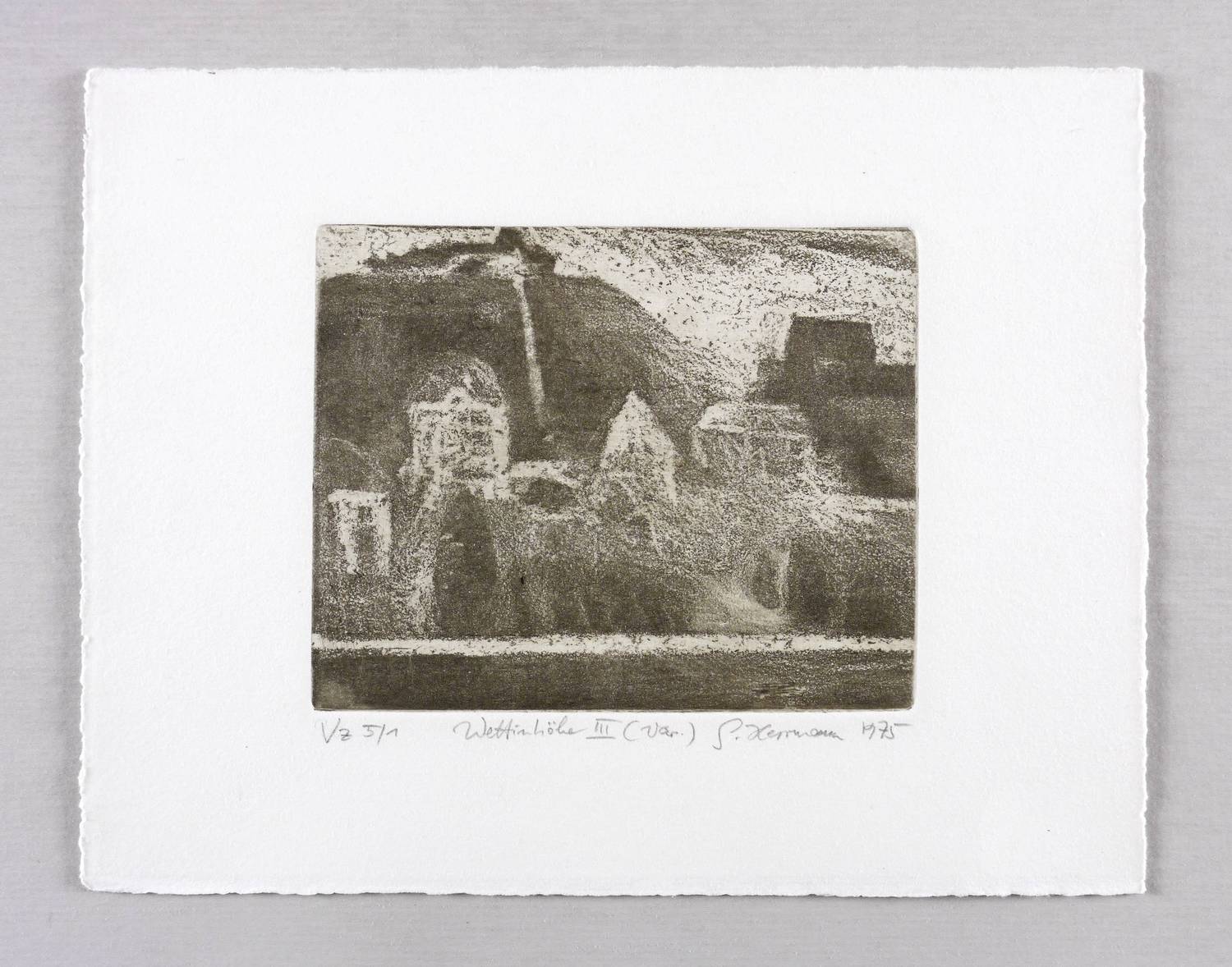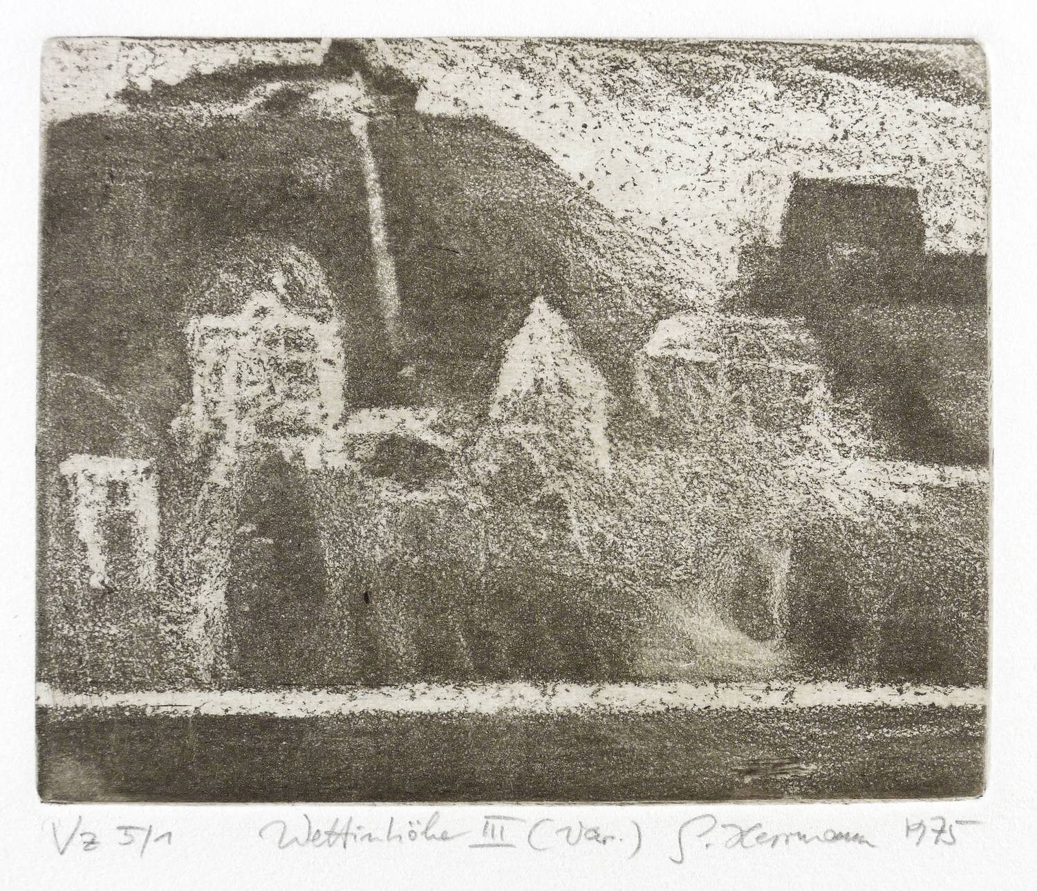 1975. Radierung / Aquatinta, in Grau-Braun, auf schwerem hellchamois Bütten. – Originale Künstlergrafik, von Gunter Herrmann. – Auflage Exemplar Nr. 1/5. – 10,9 x 13,7 cm (Darstellung / Platte), 19 x 24 cm (Blatt).