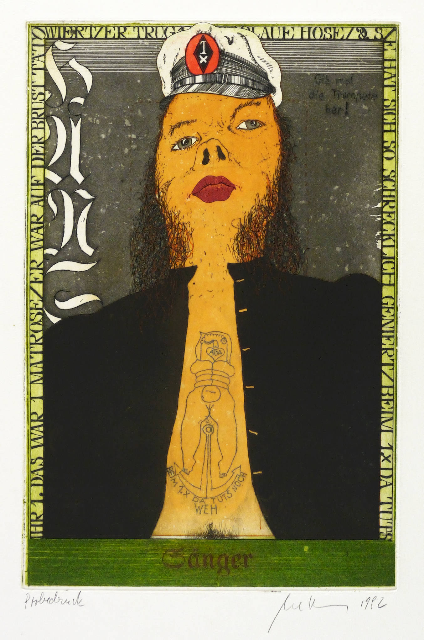 Rechts unten in Bleistift signiert und datiert: ″Uwe Bremer 1982″. Links eigenhändige Auflagenbezeichnung: ″Probedruck″. In der Platte zahlreiche Inschriften: ″HR1. DAS WAR EIN MATROSE / ER WAR AUF DER BRUST TÄTOWIERT / ER TRUG (...) BLAUE HOSE / & SIE HAT SICH SO SCHRECKLICH GENIERT / BEIM 1X DA TUTS (...) // SÄNGER // Gib mal die Trompete her!″. Trockenstempel Reinert Druck Berlin. – Sehr guter Zustand.